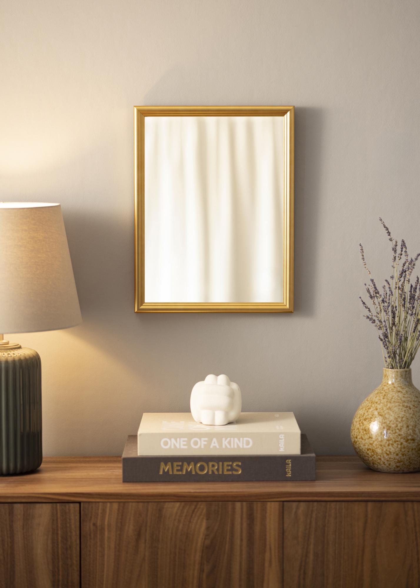 Högbo je elegantno profilirano zlato ogledalo visoke kakovosti, ki je odlično, ko iščete razkošno ogledalo z globokim profilom, ki izstopa iz stene.