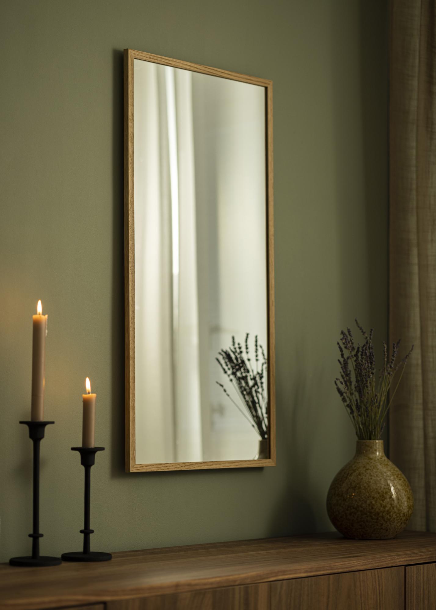 To pravokotno ogledalo je uokvirjeno v masivni hrast, kar daje vaši notranji opremi topel in organski občutek. Naravni lesen okvir ni le lep na pogled, temveč prispeva tudi k trajnostni in brezčasni zasnovi, ki bo trajala več let.