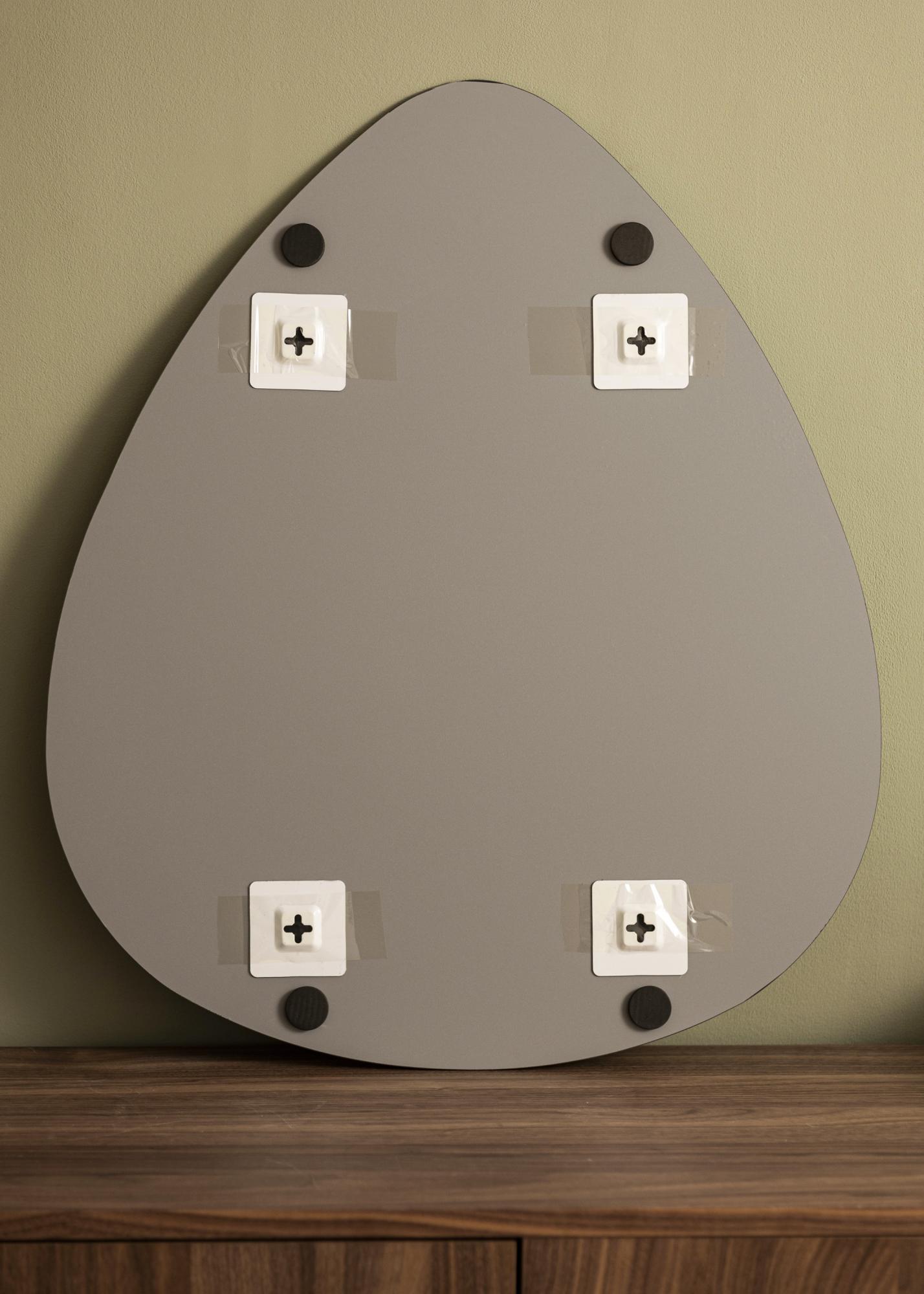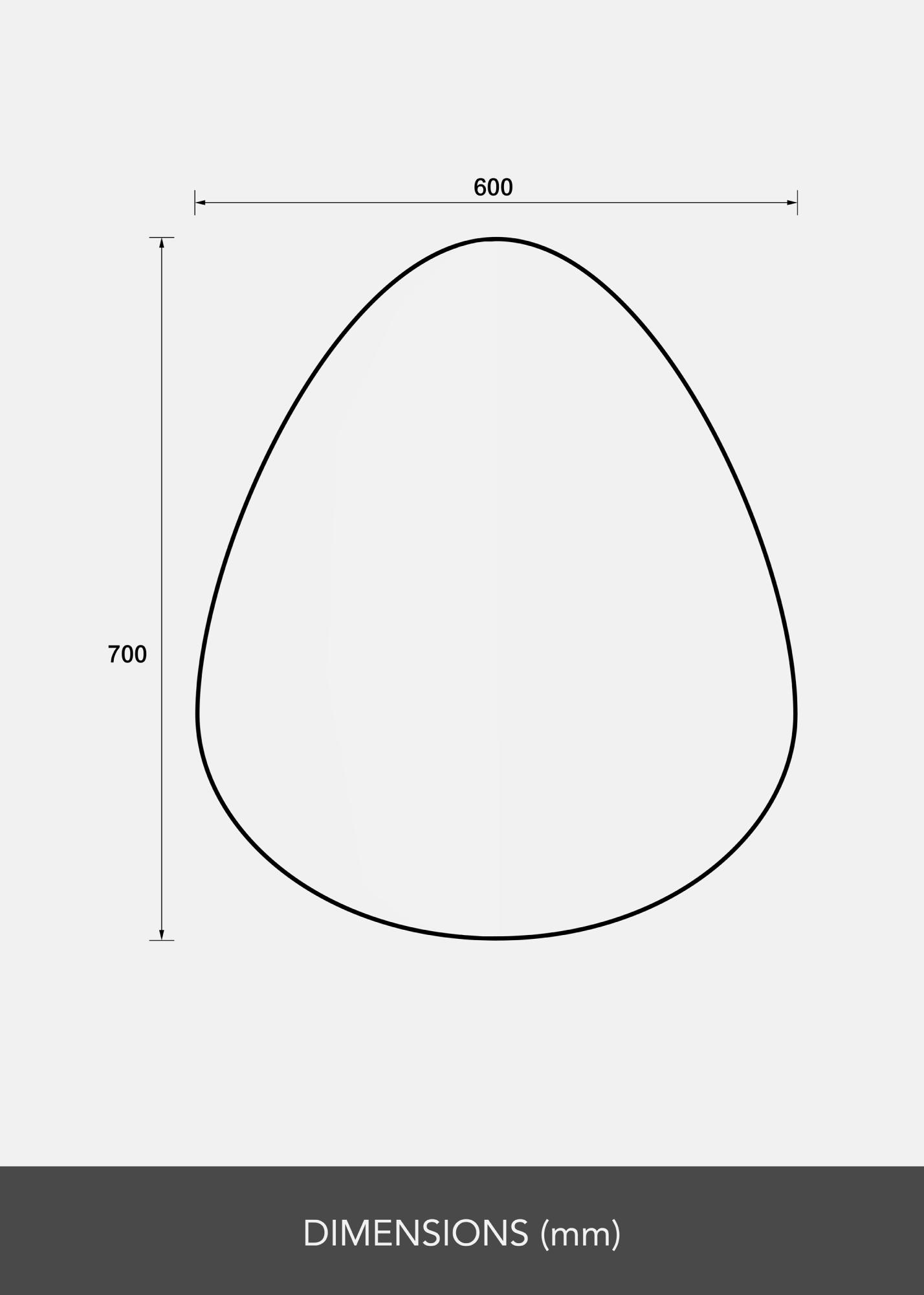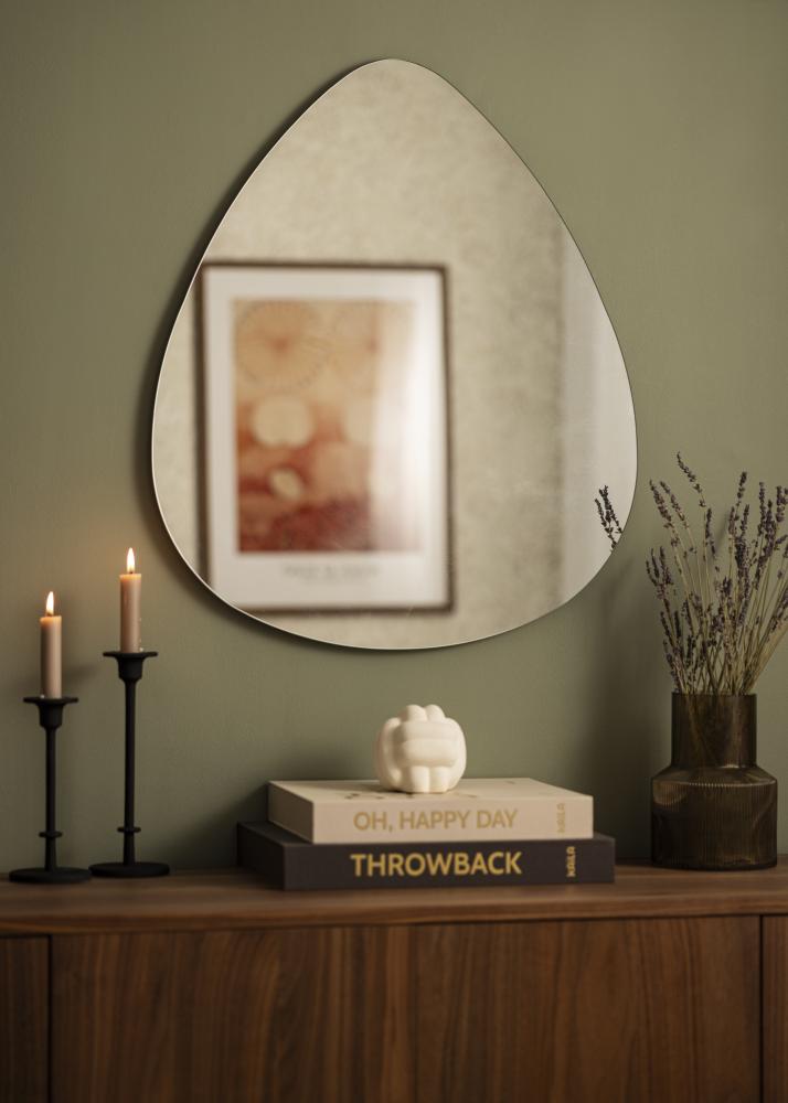 Oblikovanje ogledala je sodobno in brezčasno, s širokim, stožčastim in zaobljenim vrhom, ki ustvarja značilno silhueto v obliki kapljice. Ta oblika dodaja prostoru mehkobo in organski občutek, zaradi česar se ogledalo prilega različnim stilom notranje opreme.