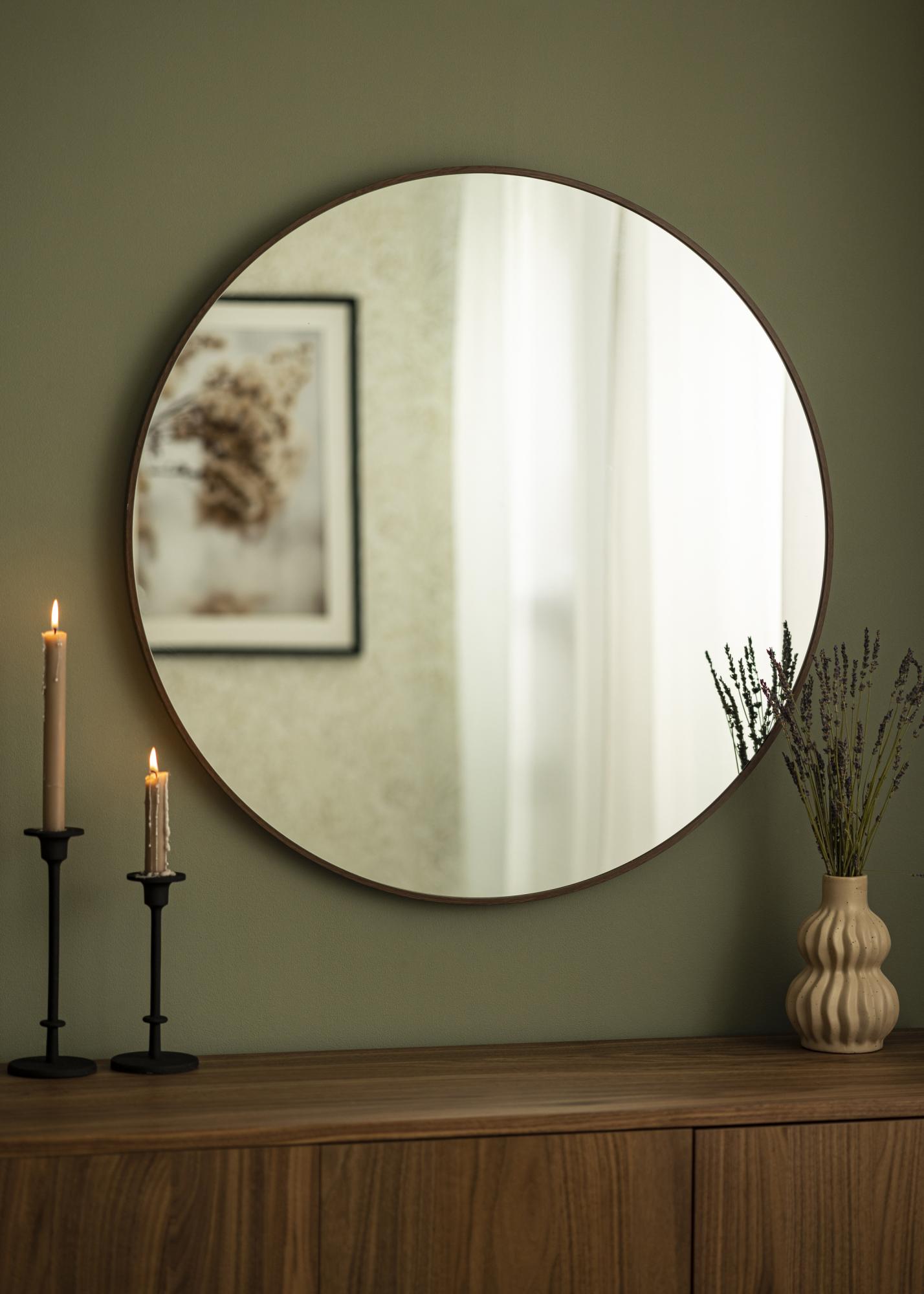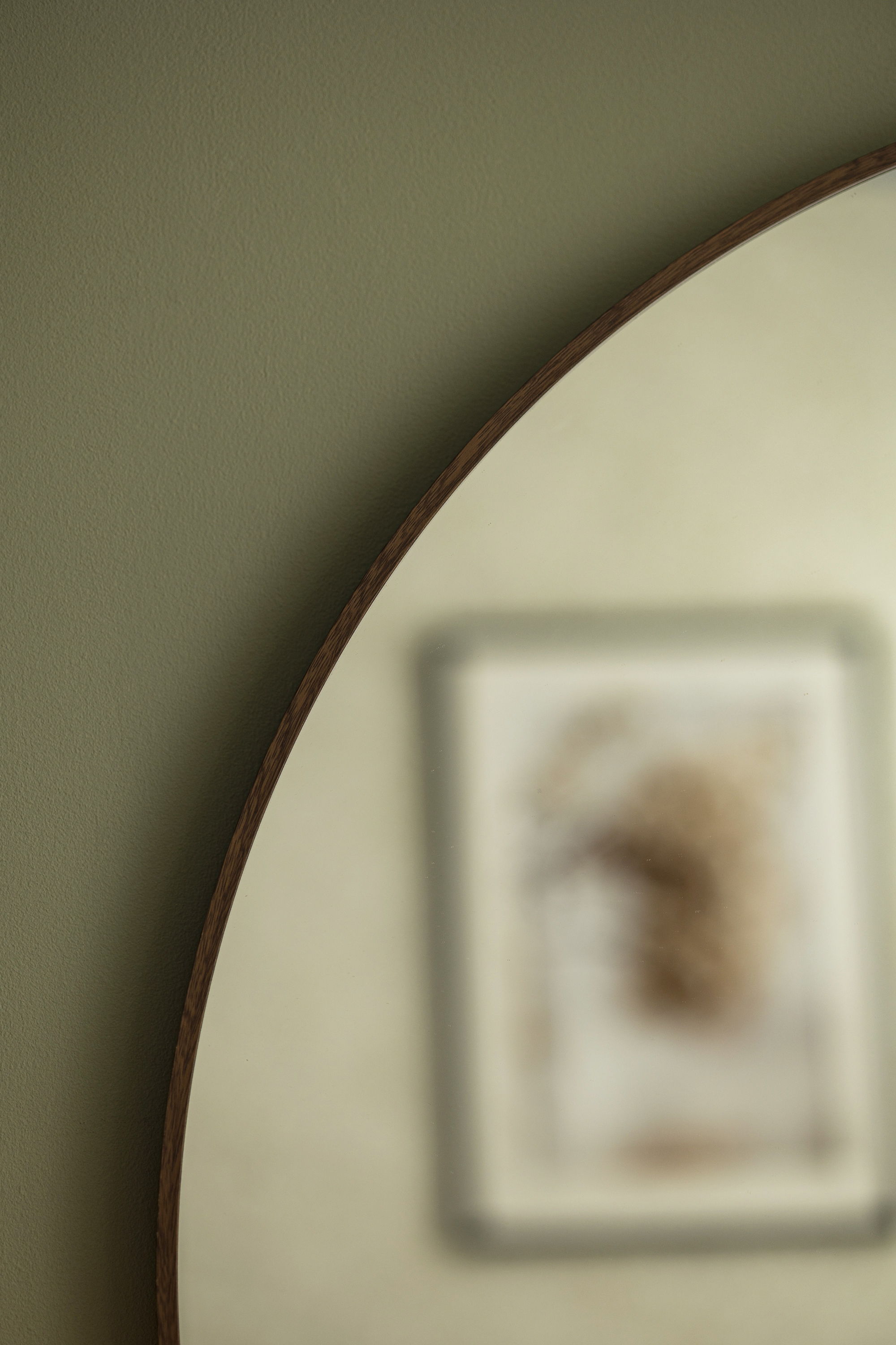 Odkrijte elegantno eleganco z našim stenskim ogledalom, ki je popolno za dodajanje občutka prostora in svetlobe v vaš dom. S svojim impresivnim premerom 80 cm bo to ogledalo takoj pritegnilo pozornost v katerem koli prostoru. Njegova okrogla oblika daje mehak in vabljiv občutek, medtem ko orehov barvni okvir iz aluminija doda pridih prefinjenosti.