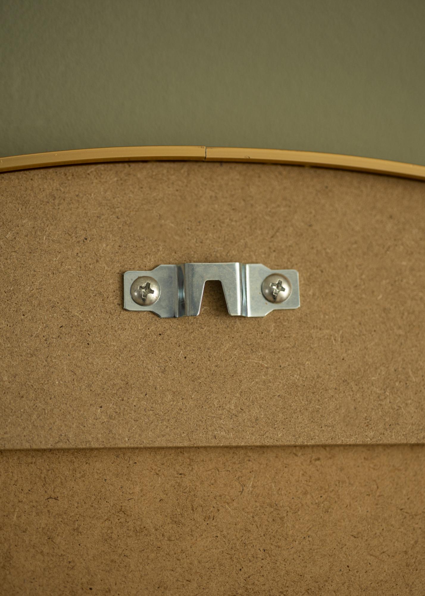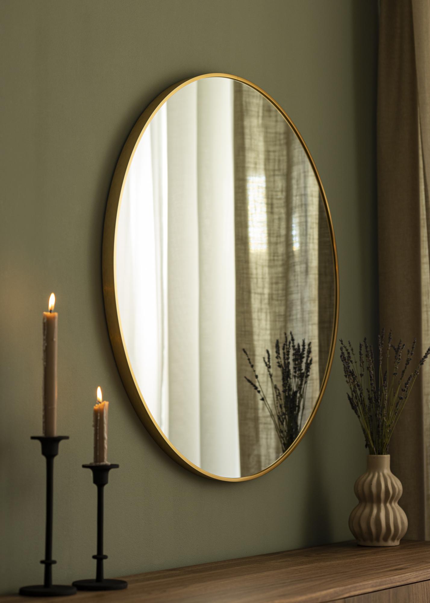 To stensko ogledalo ima klasično okroglo obliko, obdano z elegantnim zlatim aluminijastim okvirjem. Barva in sijaj okvirja ustvarjata razkošno vzdušje in postane opazen element na kateri koli steni. Okrogla oblika prispeva k mehkem in harmoničnem občutku v sobi.