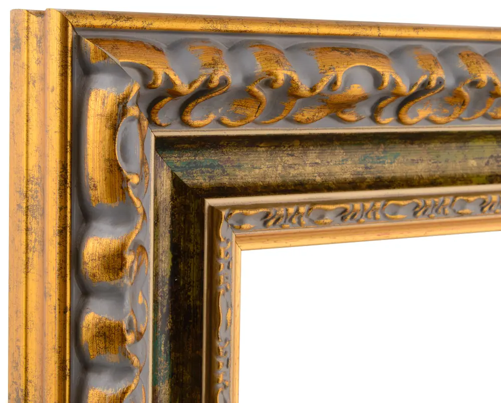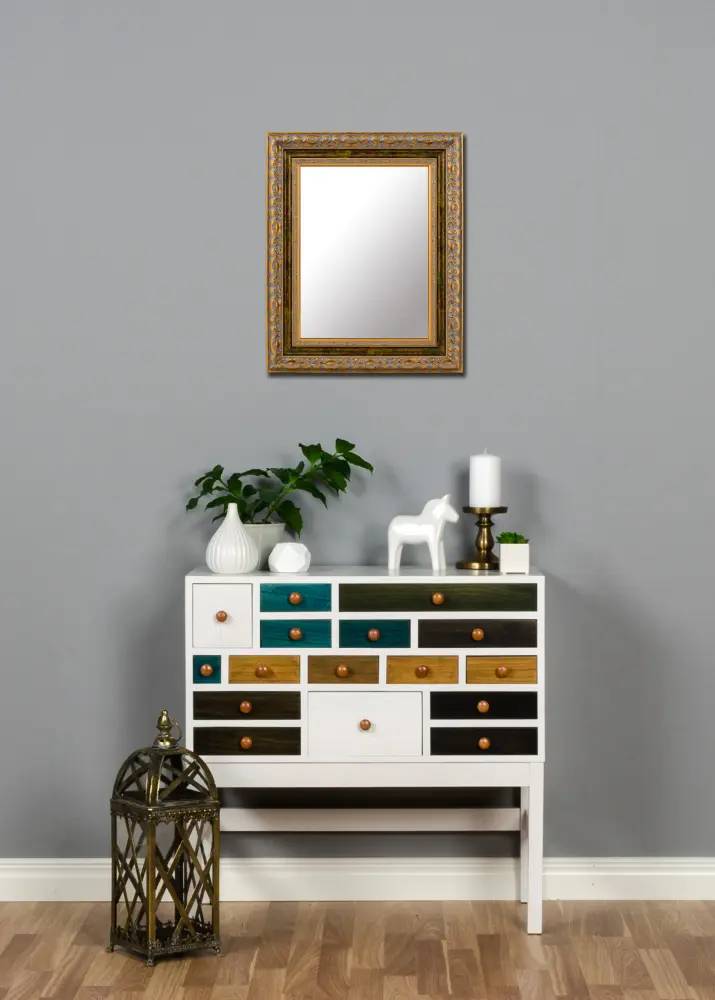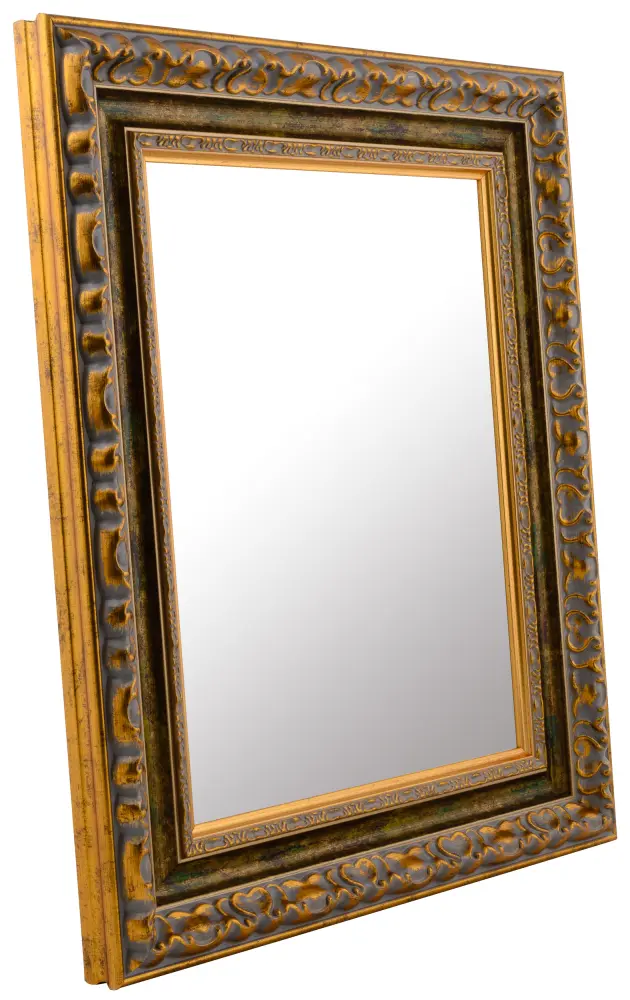 Z ustreznim ogledalom lahko dvignete celotno steno! To razkošno zlato ogledalo ima zanimiv dizajn, ki pritegne pozornost. Spredaj ima lesen okvir tako veliko kot manjše obrobo s prepletajočim vzorcem, ki ga prekinja obrabljen del. Površina je obdelana, da izgleda značilno starano. Ker je izdelano po vaših merilih, ste lahko prepričani, da bo ustrezalo točno tam, kjer ga želite imeti!