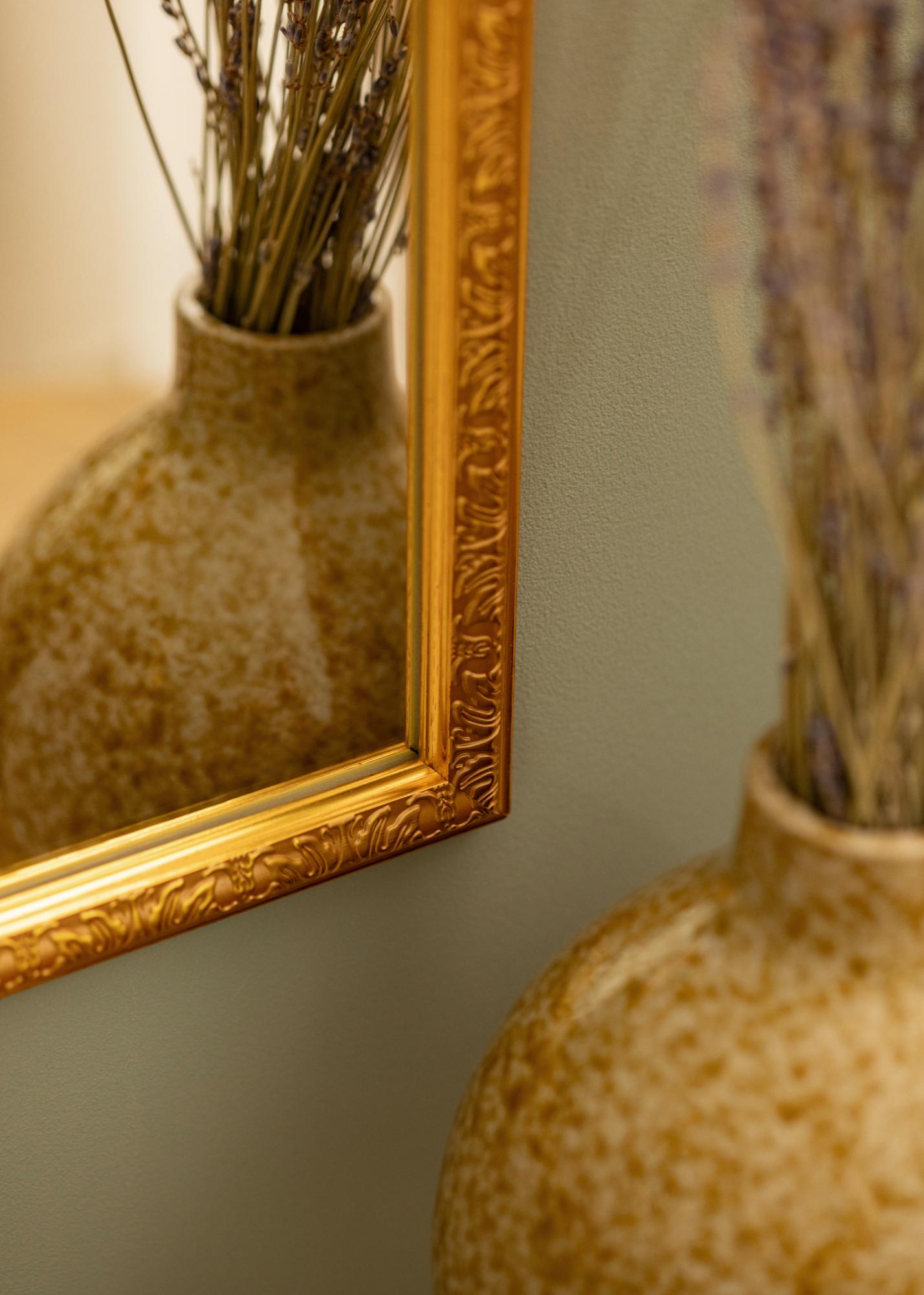 Če iščete razkošno zrcalo v zlati barvi, lahko prenehate iskati zdaj. Nostalgia Zlato je stensko zrcalo s 2,8 cm širokim okvirjem z elegantnim profilom in čudovitim dekorativnim vzorcem. Zrcalno steklo bo odbijalo svetlobo v vaši sobi, hkrati pa bo zrcalo samo postalo stilski element na vaši steni. Na zadnji strani je stenski nosilec za lažje obešanje.