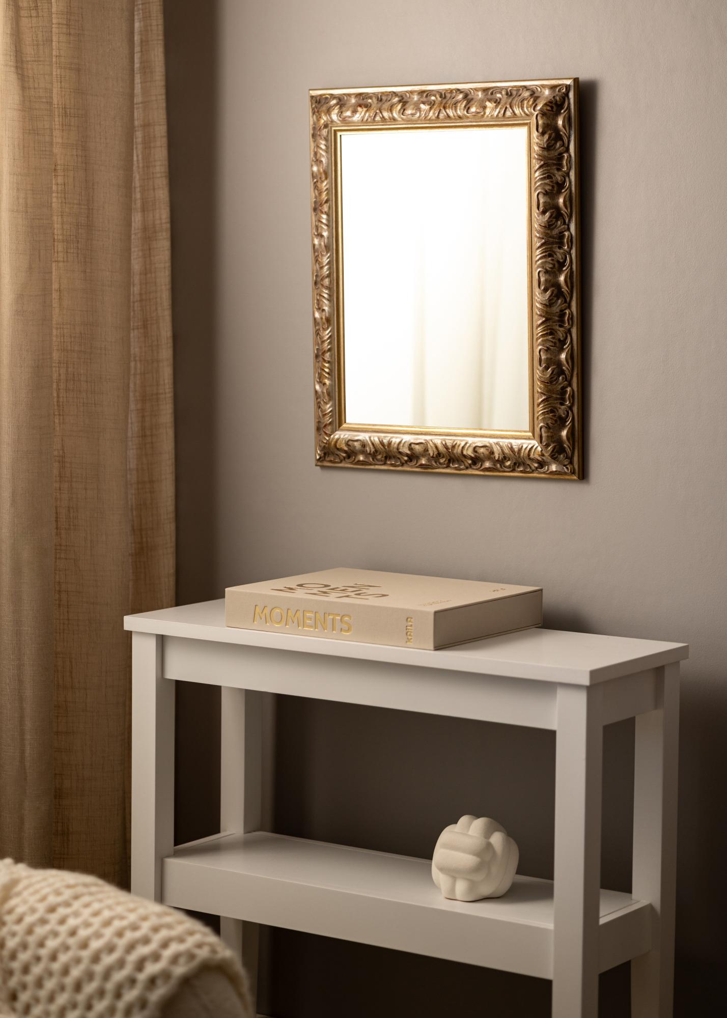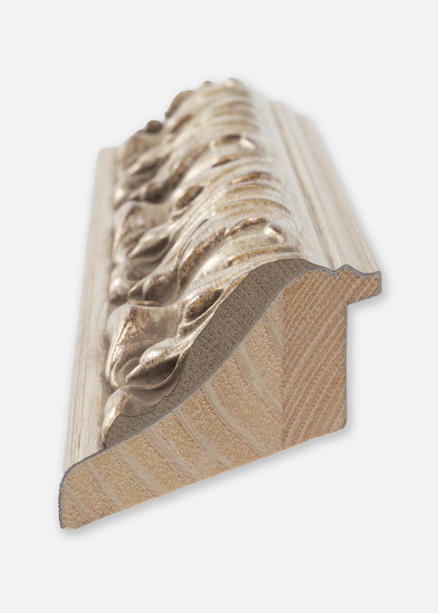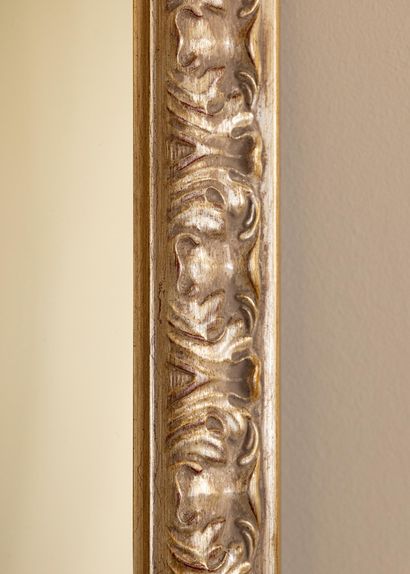 Okvir je izdelan iz bora in ima starinsko srebrno površino z nežnimi zlatimi detajli in rdečimi pridihi. Ta barvna kombinacija ustvarja lep kontrast in ogleduje daje klasičen in prefinjen videz. Dekorativni videz pomeni, da je ogledalo popolno za okvirje, kjer se želi doseči eleganten občutek.