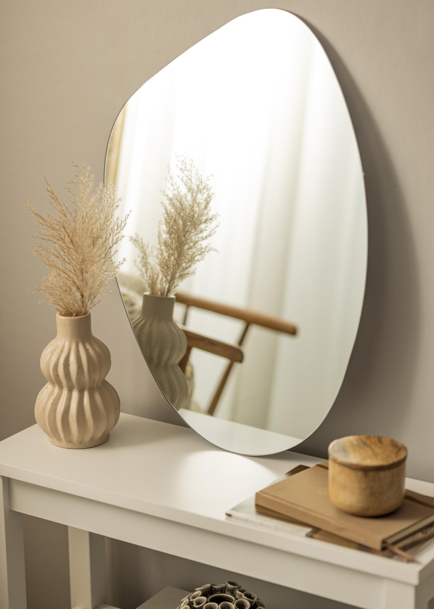 To ogledalo ima minimalističen izraz, z oblikovanjem brez okvirja in tankim ogledalnim steklom. Veliko je 50x60 cm in ga je enostavno namestiti na steno, zahvaljujoč stenskemu pritrdišču na hrbtni strani ogledala.