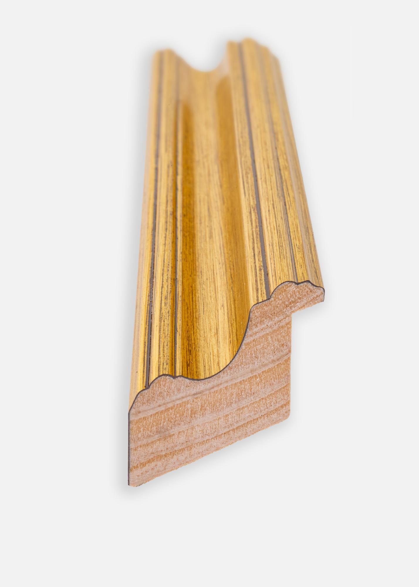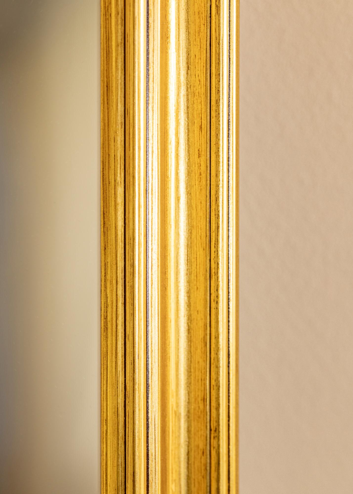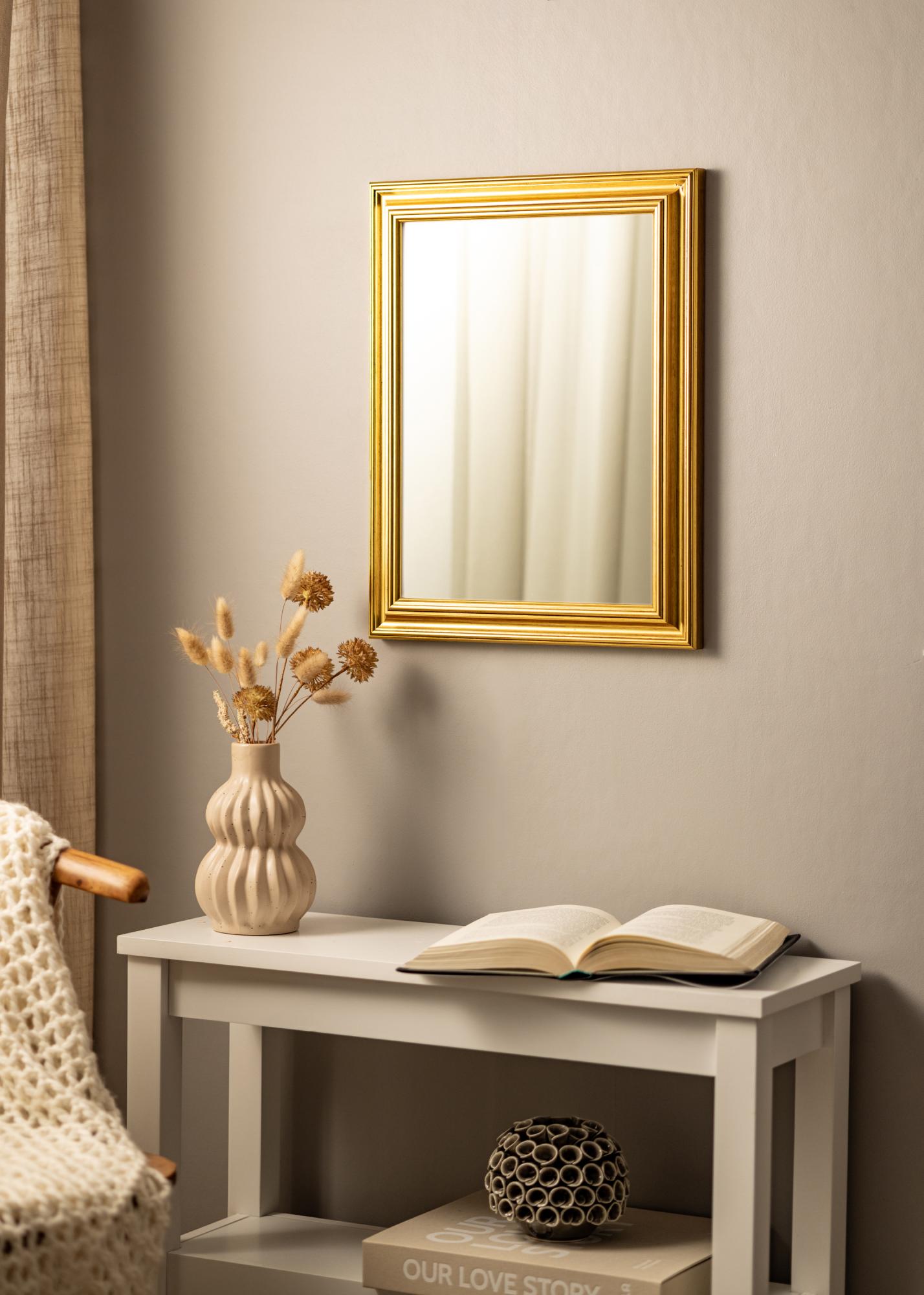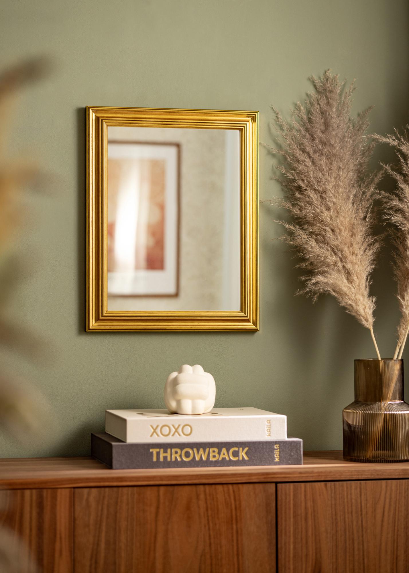 Klasično profilirano ogledalo z zlato obarvanim okvirjem iz lesa, ki deluje ročno poslikano, kar daje ogledalu živahen občutek in lep sijaj. Širok okvir daje ogledalu ekskluziven videz in omogoča, da se ogledalo prilega enako dobro v dom opremljen z antikvitetami kot v moderno opremljeno stanovanje z romantično ali elegantno notranjostjo. Kombinirajte ogledalo z nekaj medeninastimi lučkami in slikami v zlatih okvirjih, da ustvarite celovit občutek v prostoru.