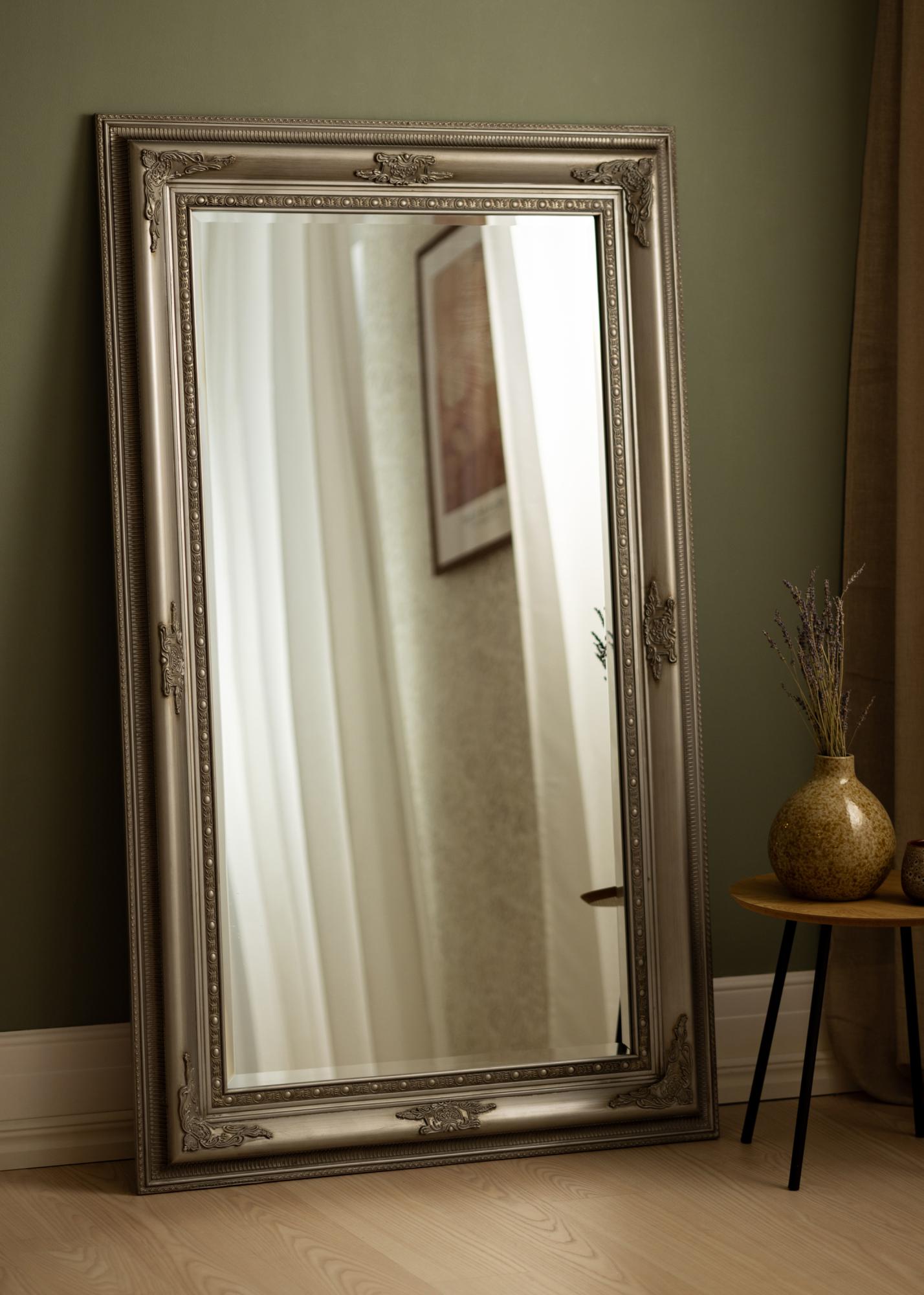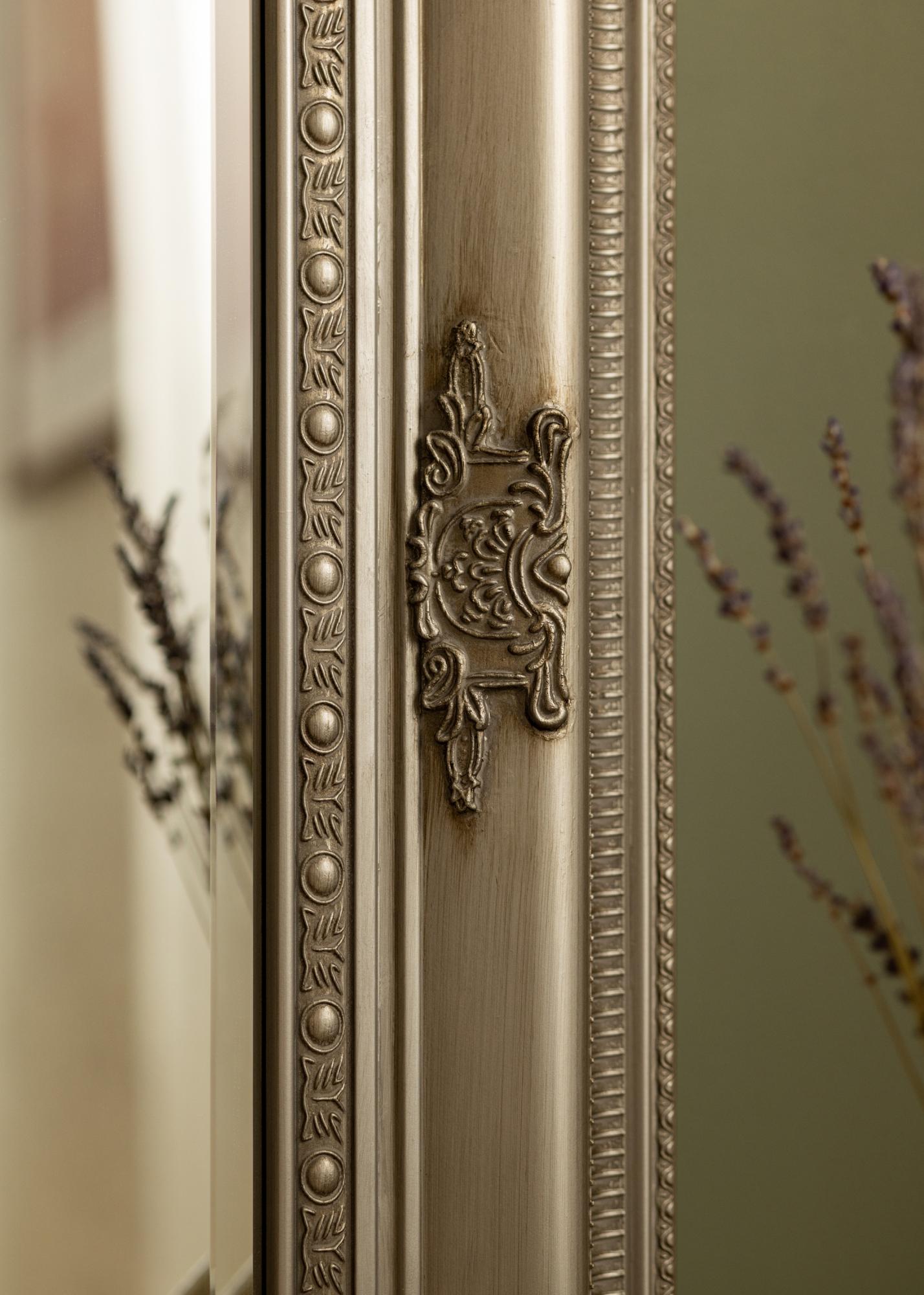 Srebrno ogledalo klasičnega stila z vzorčnim profilom in okrasjem cvetlic okoli. Antični občutek ogledala pomeni, da se lepo ujema z notranjo opremo v stilu pohištva, vendar pa postane tudi zanimiv kontrast v poenoteni moderni notranjosti. Oblika poskrbi, da se ogledalo dobro prilega tako v preddverju, kot v veliki garderobi ali na steni v spalnici, kjer imajo oblačila pomembno vlogo v notranji opremi. Poudarite ogledalo z dodatki za notranjo opremo v srebrni barvi v prostoru.