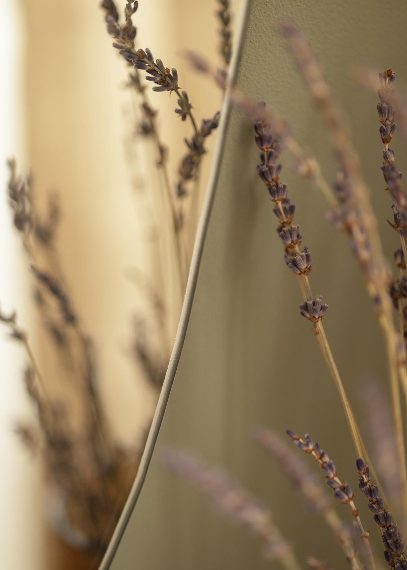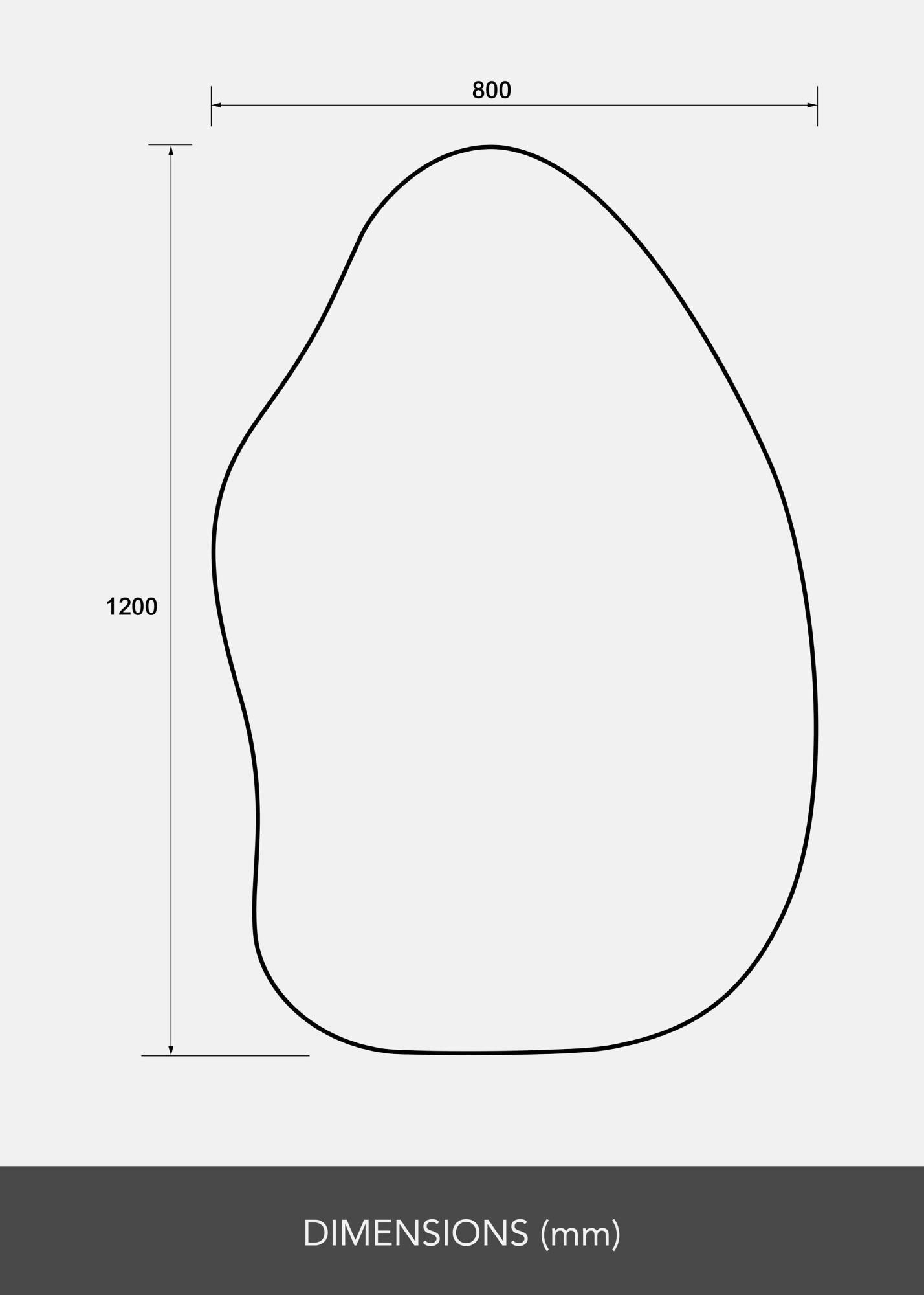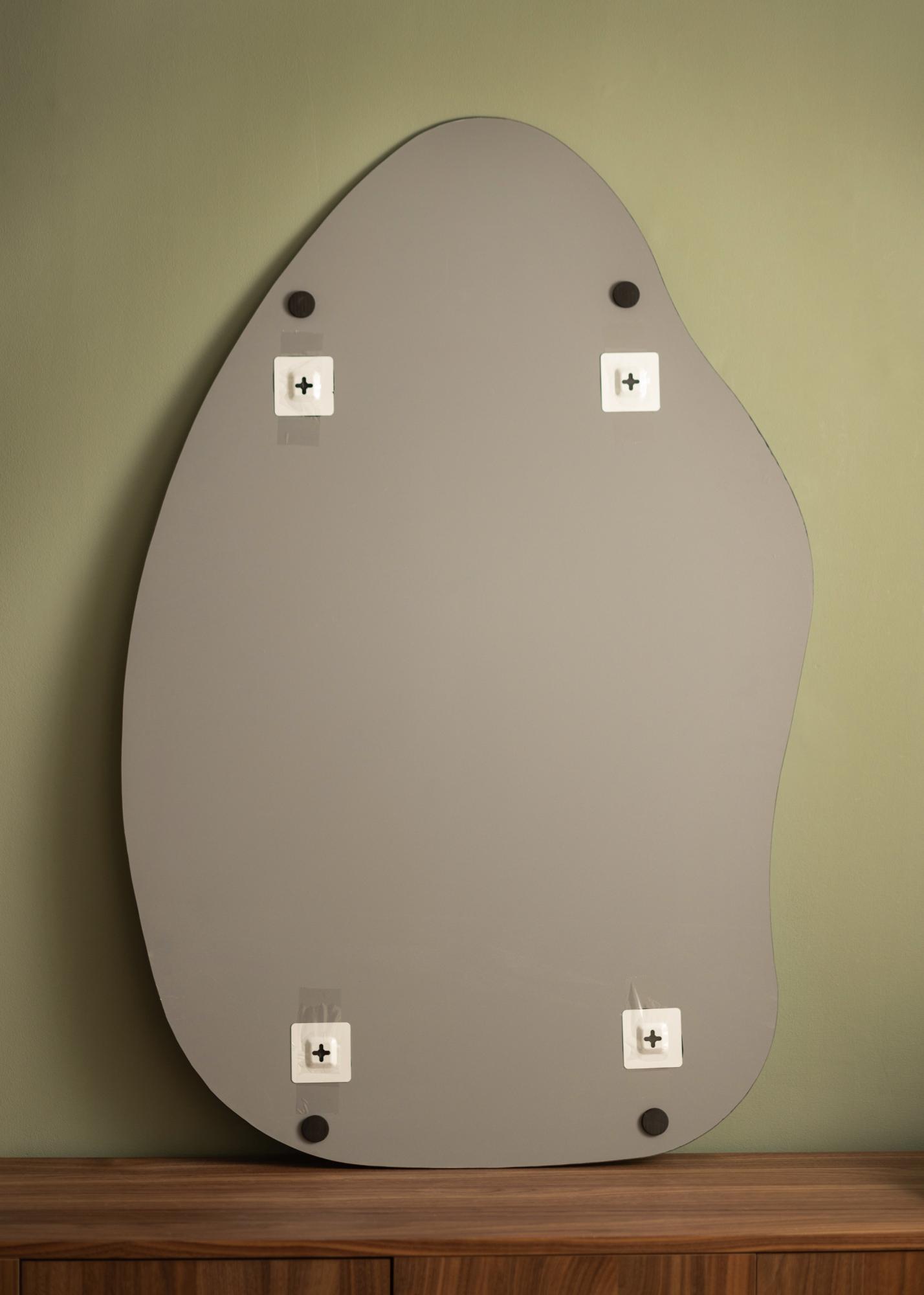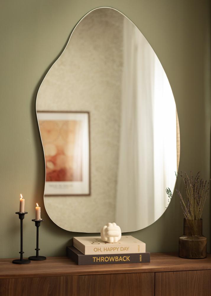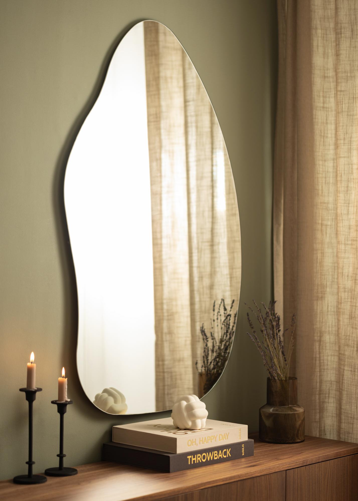 Ogledalo ima mehko in organsko obliko, ki spominja na vodno kapljico ali pokončen list, kar prostoru daje eleganten in sodoben občutek. Ta edinstvena oblika naredi ogledalo začetek pogovora in umetniško delo samo po sebi, hkrati pa izpolnjuje svojo praktično funkcijo.