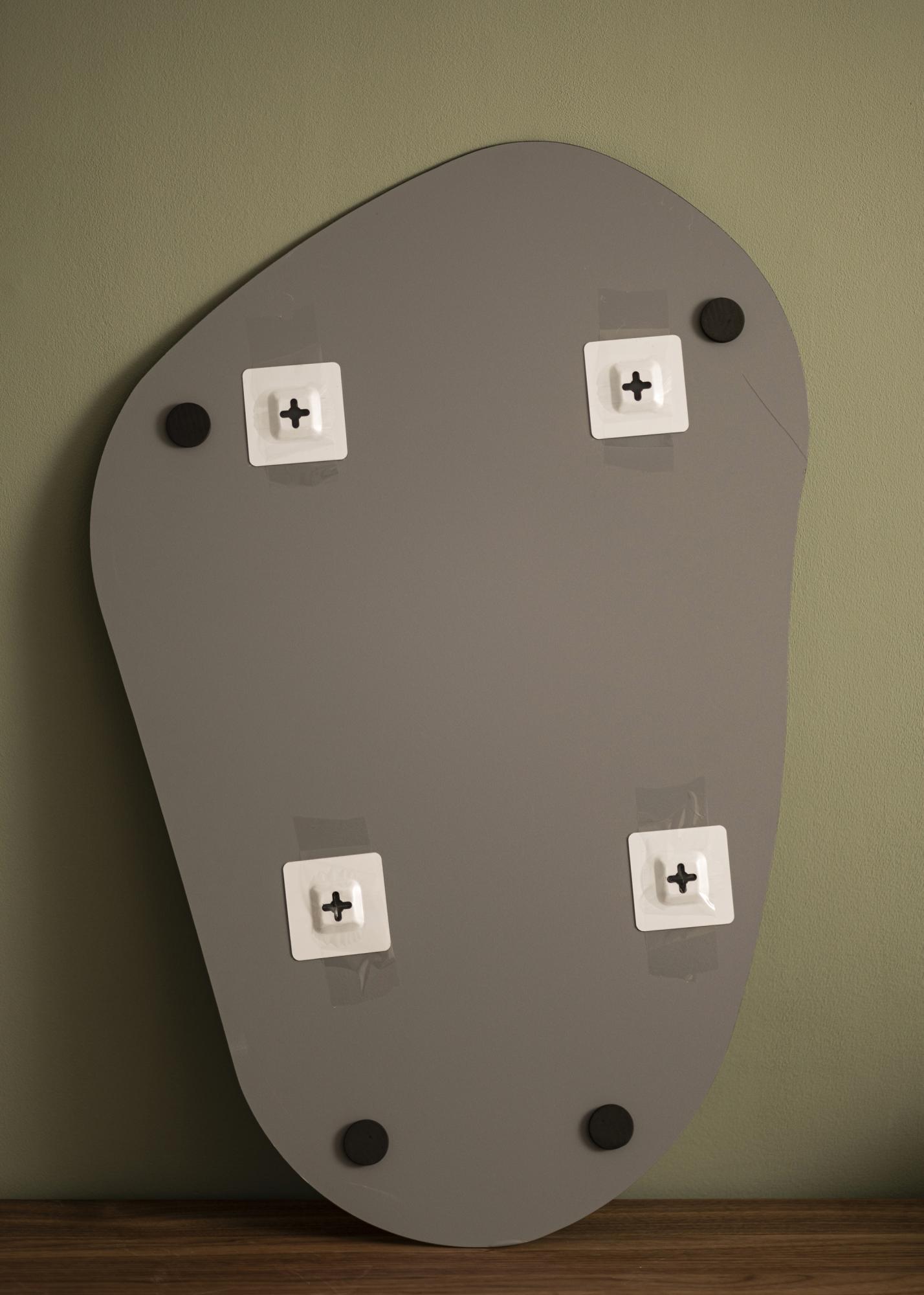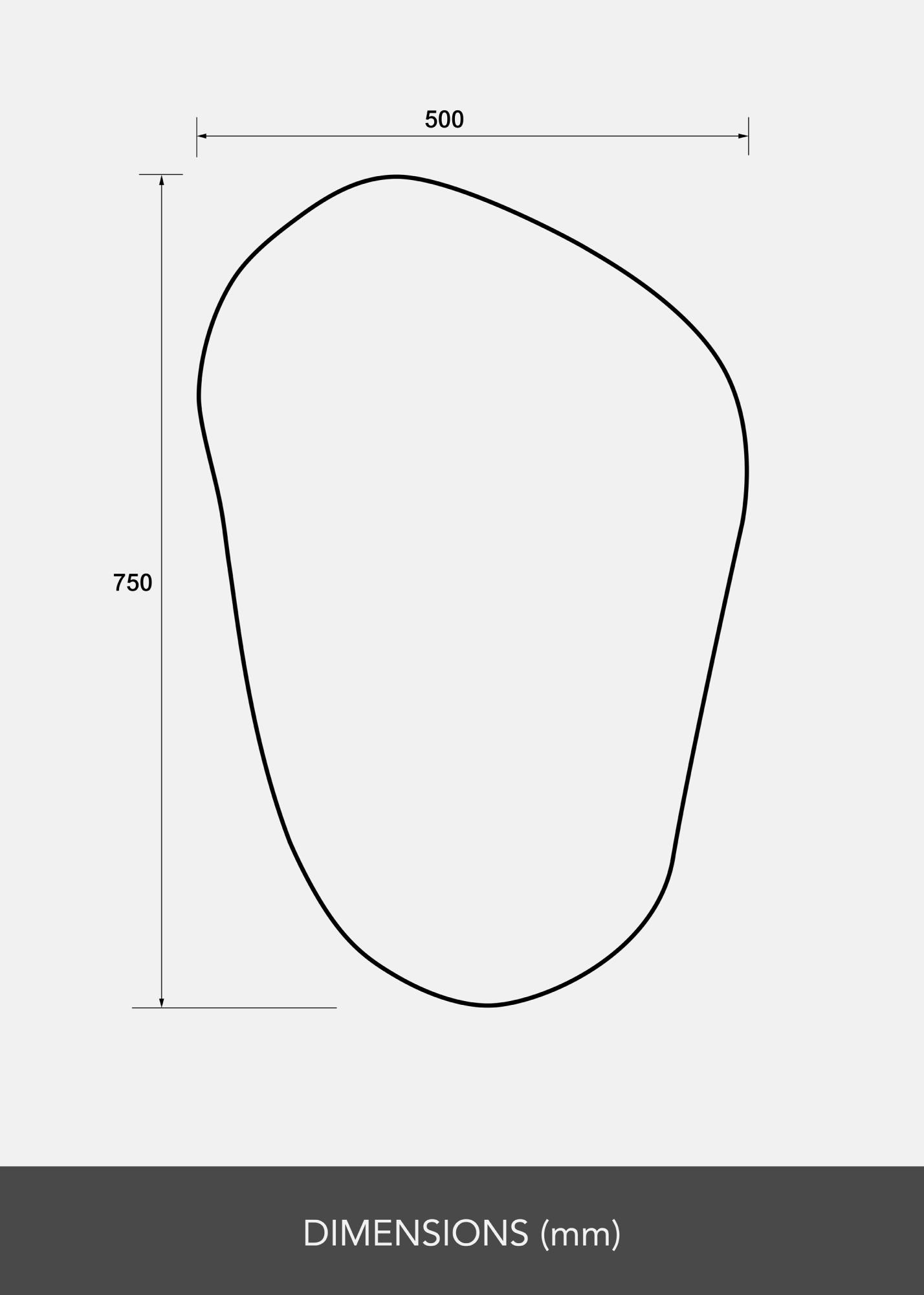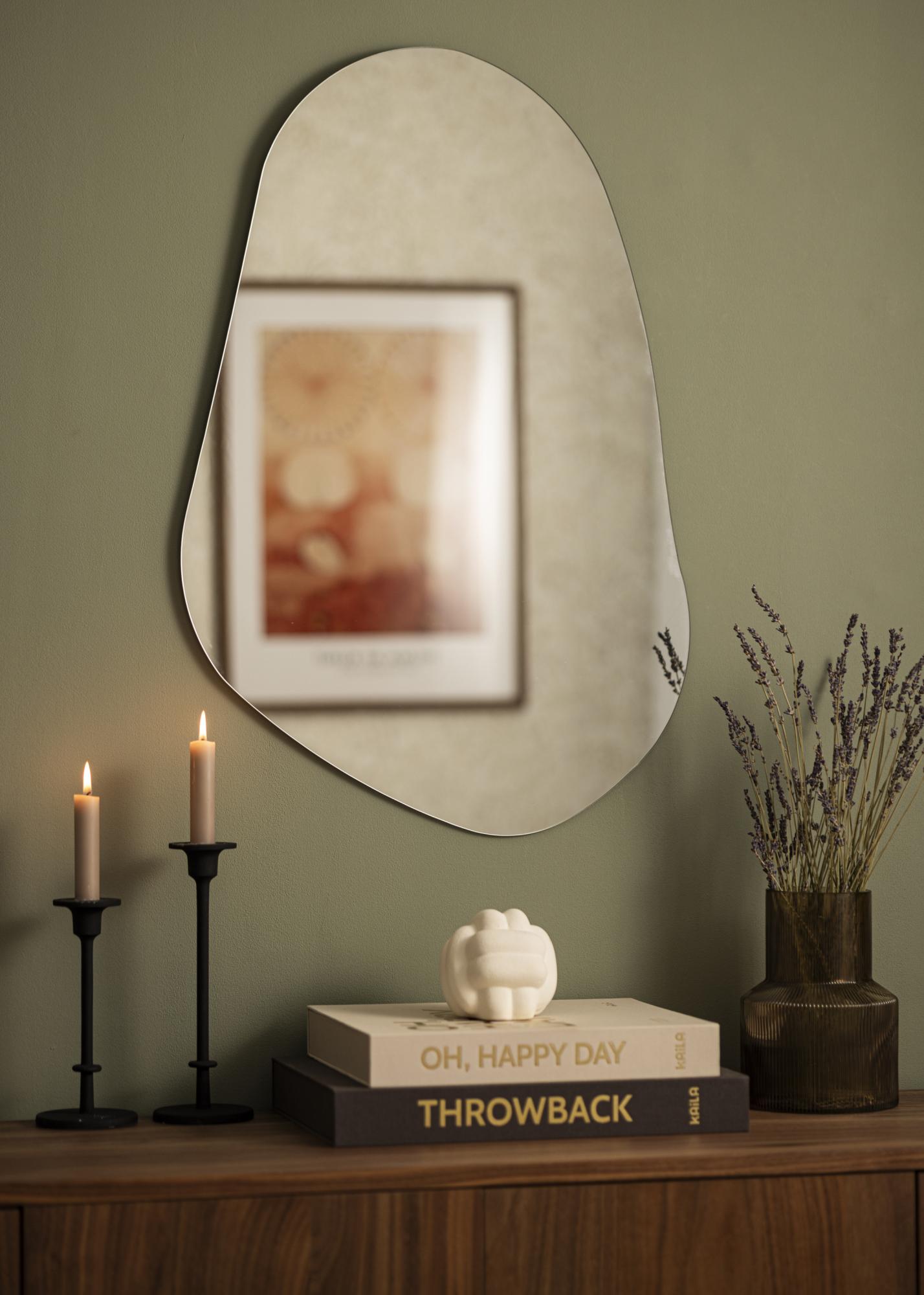 To Ogledalo ima organsko, asimetrično in mehko valovito obliko, ki prostoru doda moderen in umetniški pridih. Njegove zaobljene krivulje in odsotnost ravnih robov spominjajo na prosto narisano silhueto, podobno naravno oblikovanemu kamnu ali podolgovati kaplji.