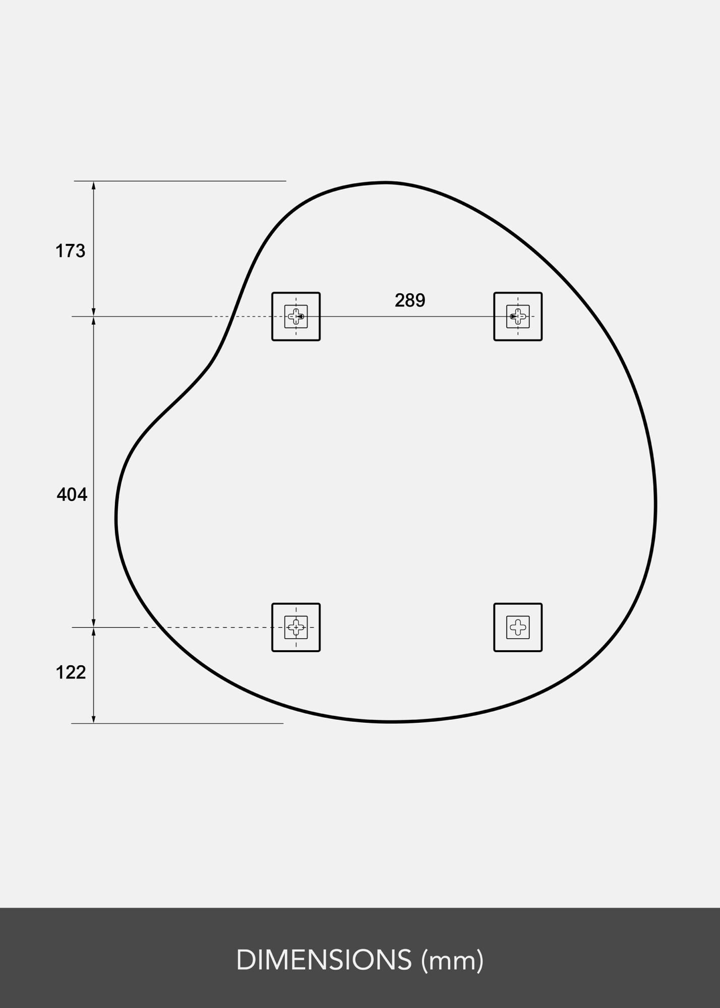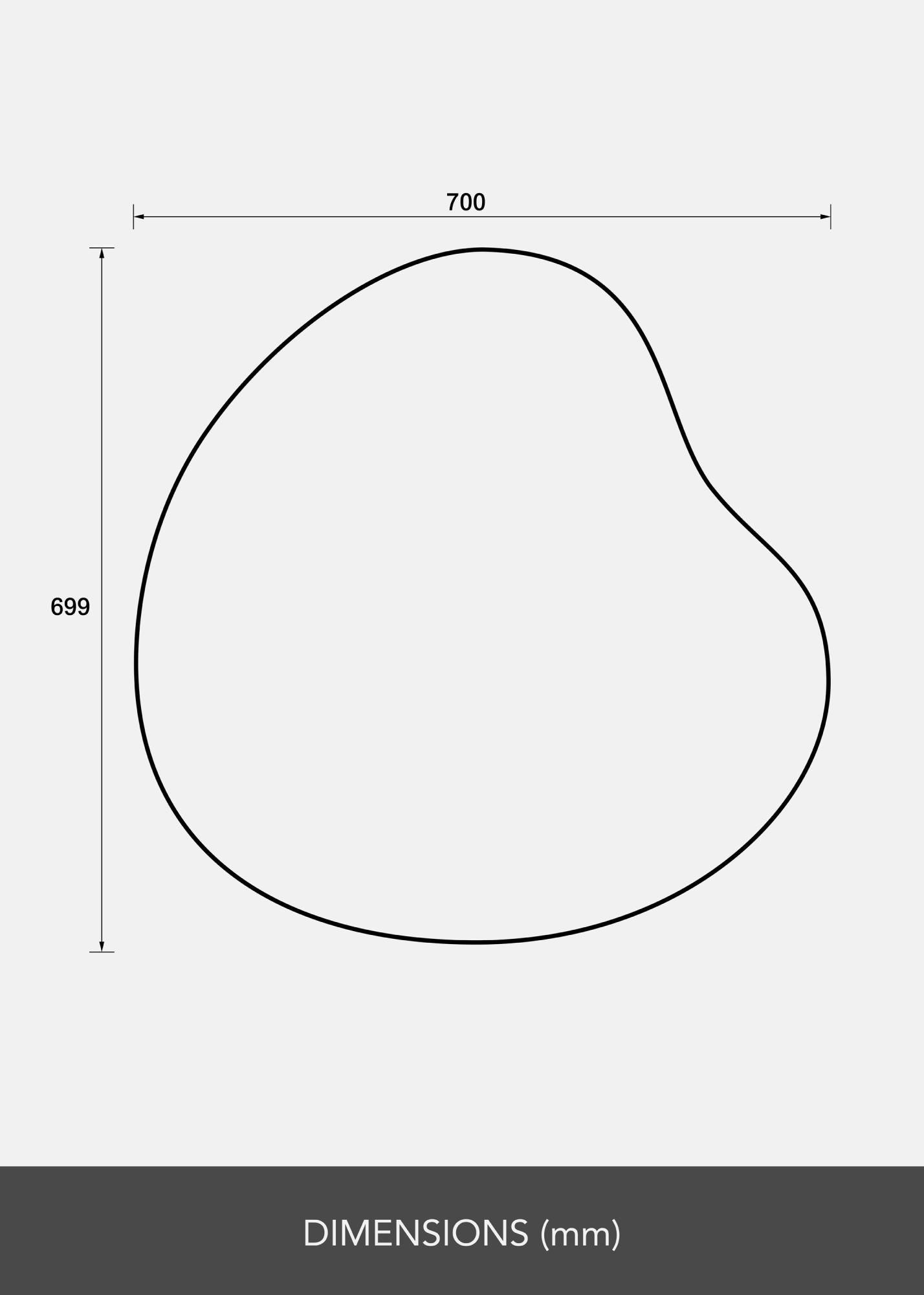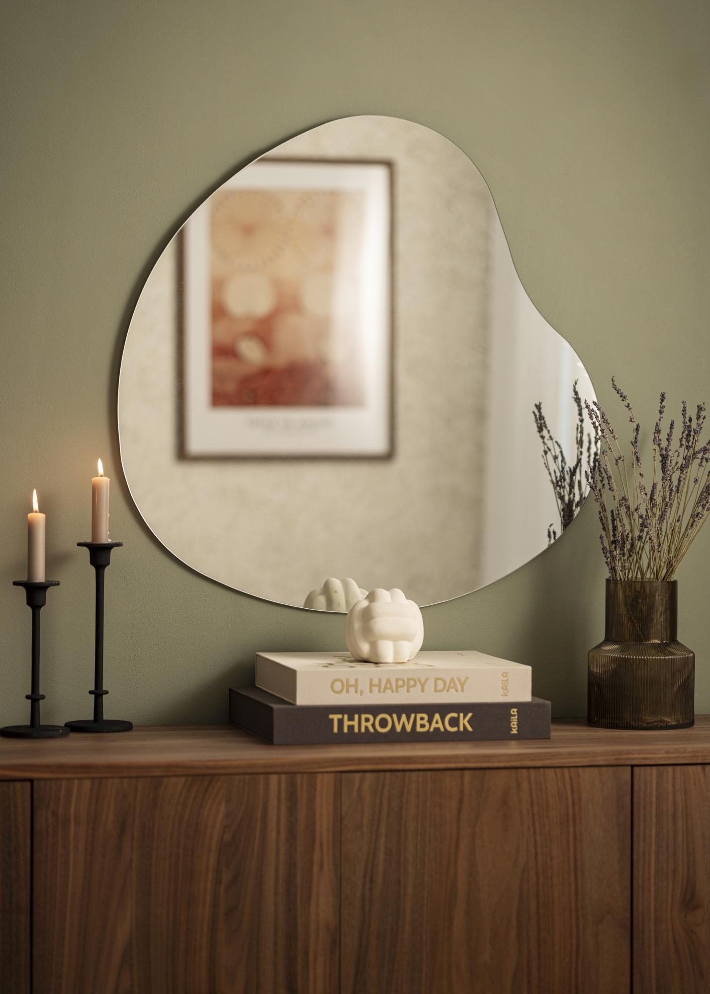 Ogledalo ima mehko zaobljeno, asimetrično obliko, ki se graciozno zvija in daje vtis gibanja in mehkobe. Ta dizajn naredi ogledalo umetniški element na steni, hkrati pa ohranja svojo praktično funkcijo.