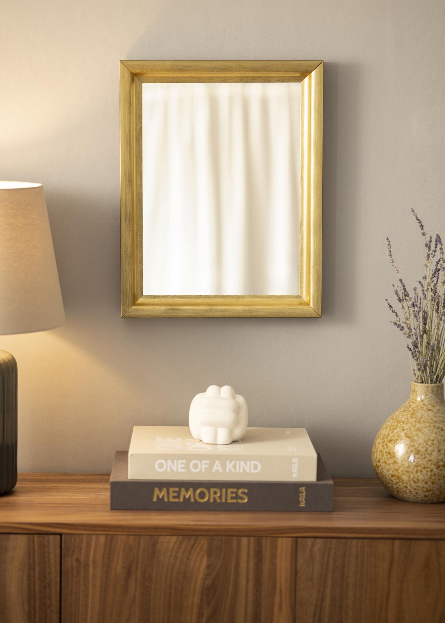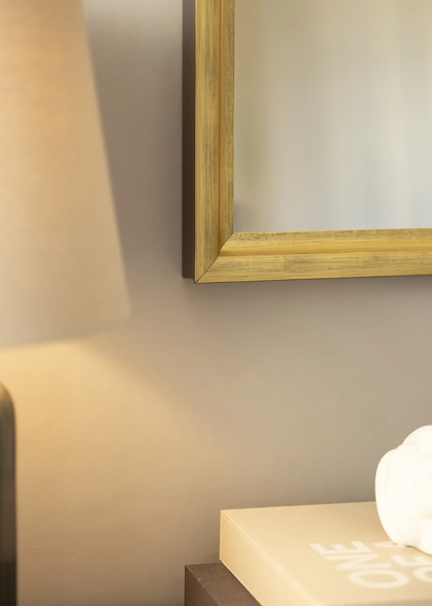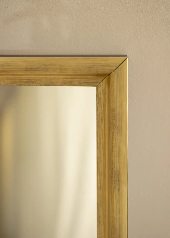 Klasično ogledalo, kjer si sami izberete, kako veliko ogledalo želite imeti. S svojim širokim in globokim profilom je to zagotovo ogledalo, ki ga opazite. Ogledalo ima mehko prijetno zlato barvo, ki daje prijeten in lep občutek.