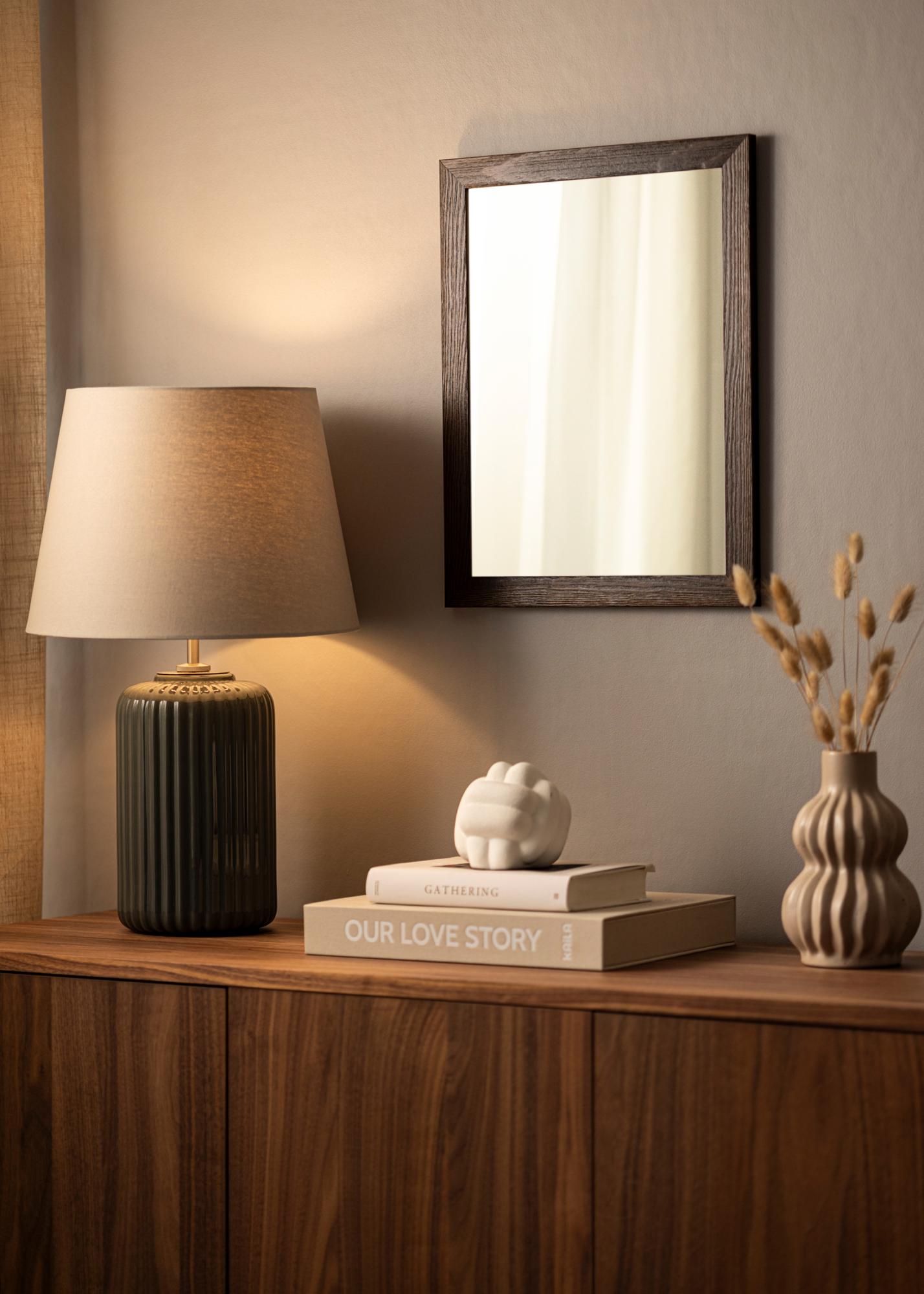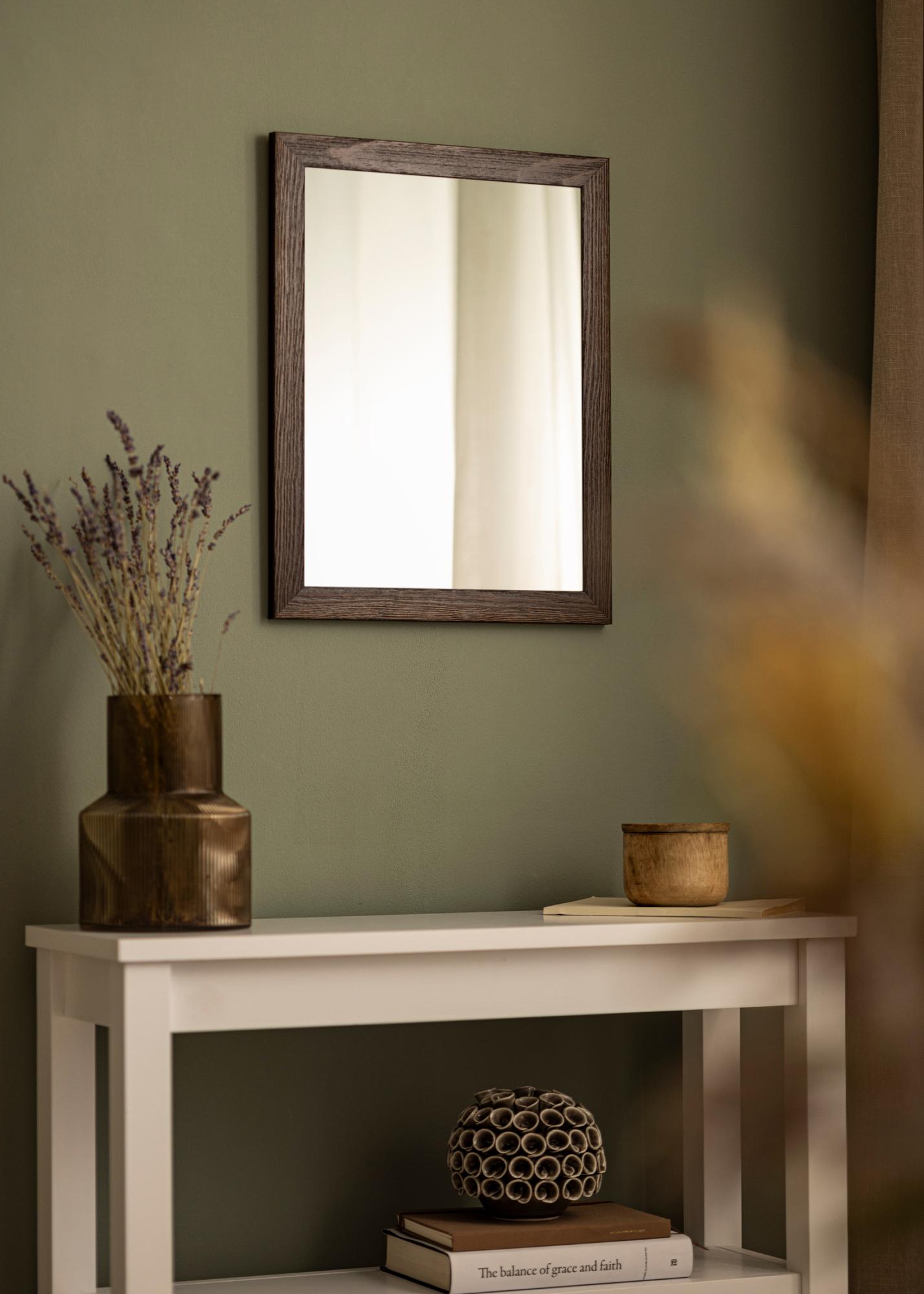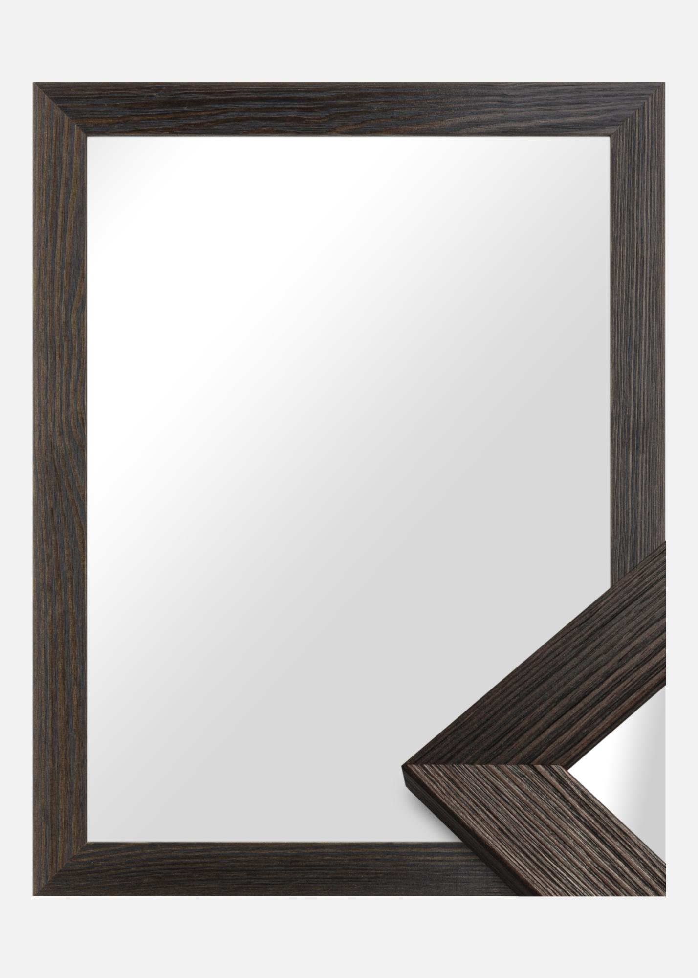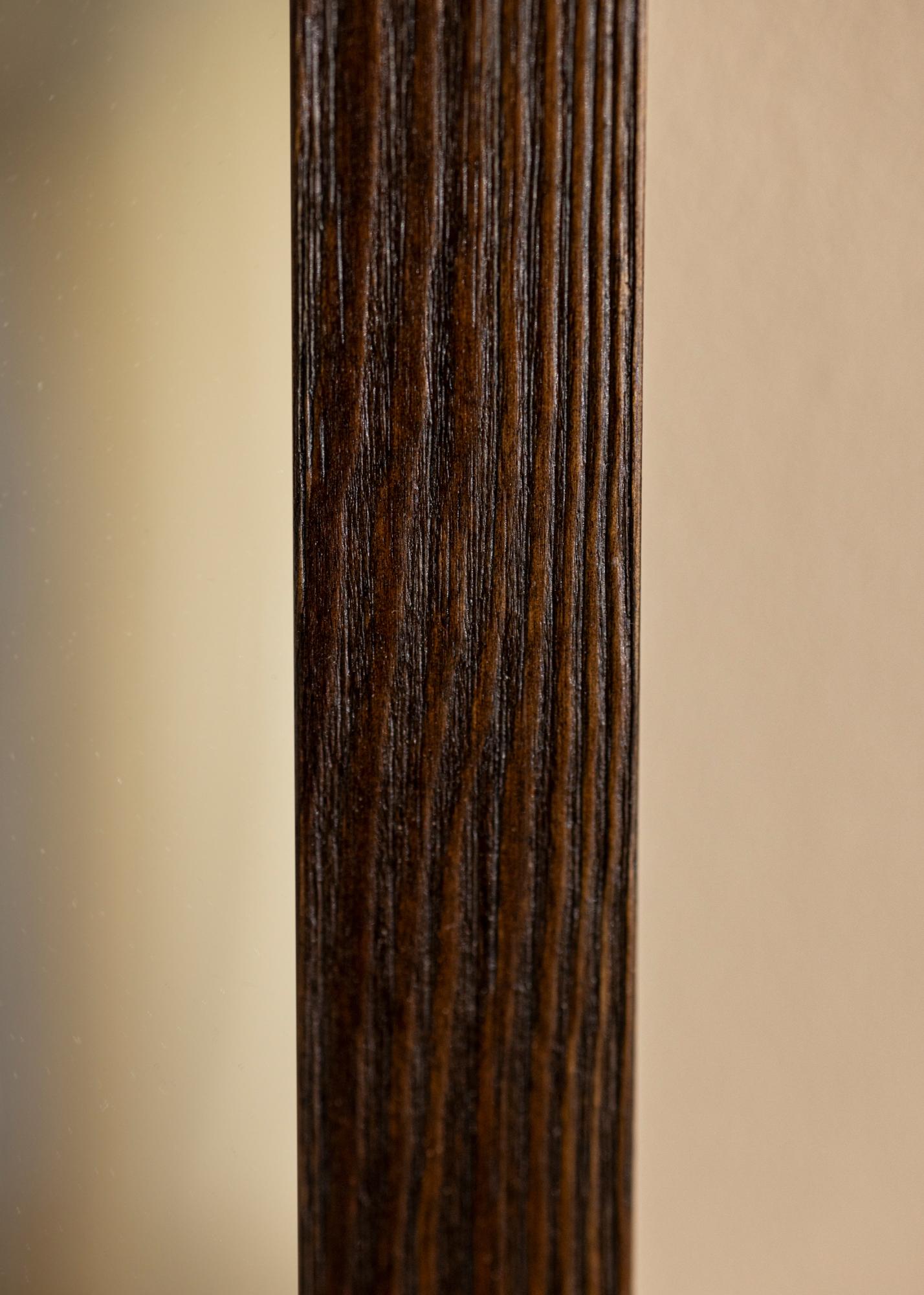 Trdna rjava ogledalna okvir z vidnimi lesnimi zrni in širokim profilom. Dobro ustreza, ko iščete temen lesen okvir z naravnim občutkom.