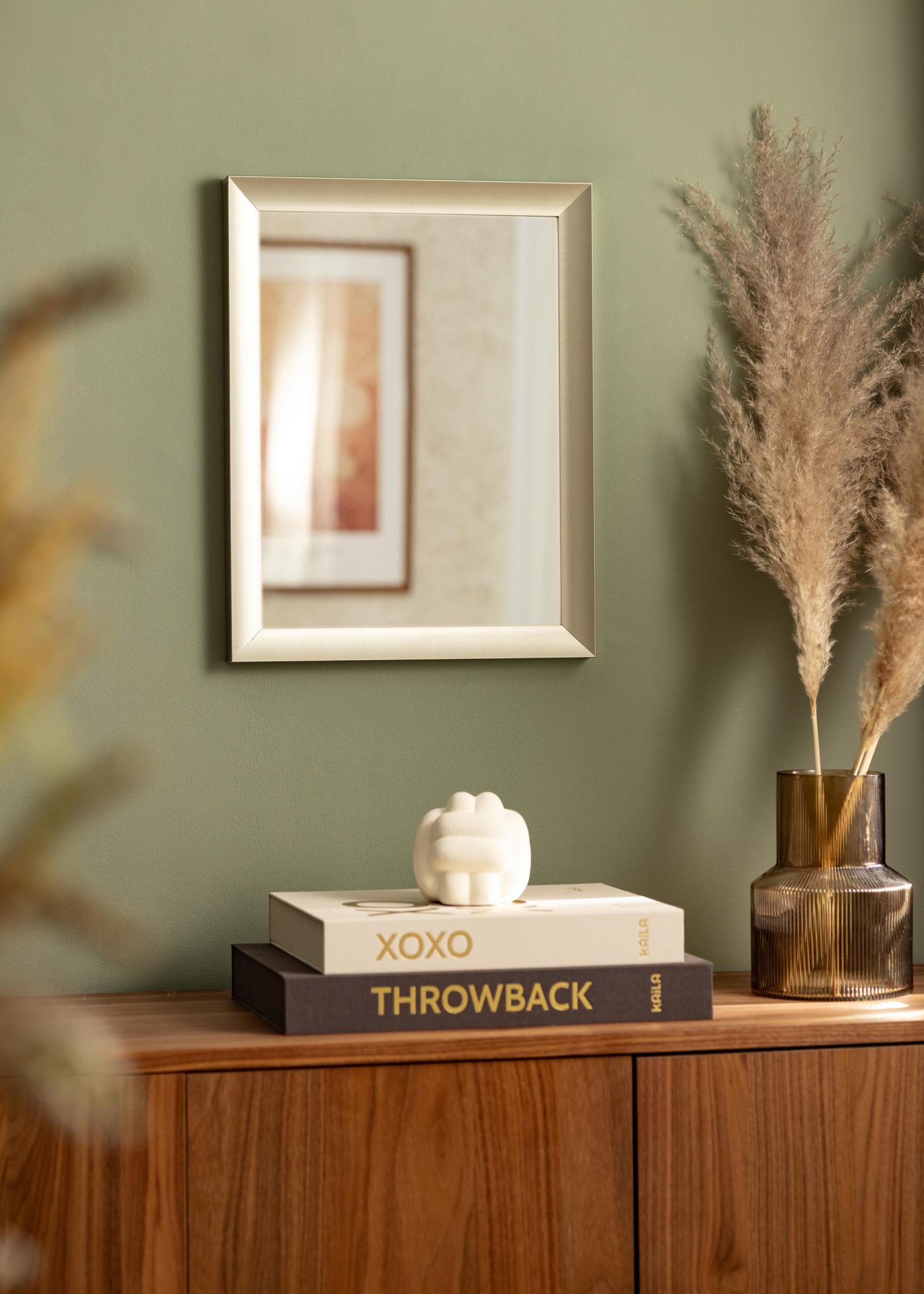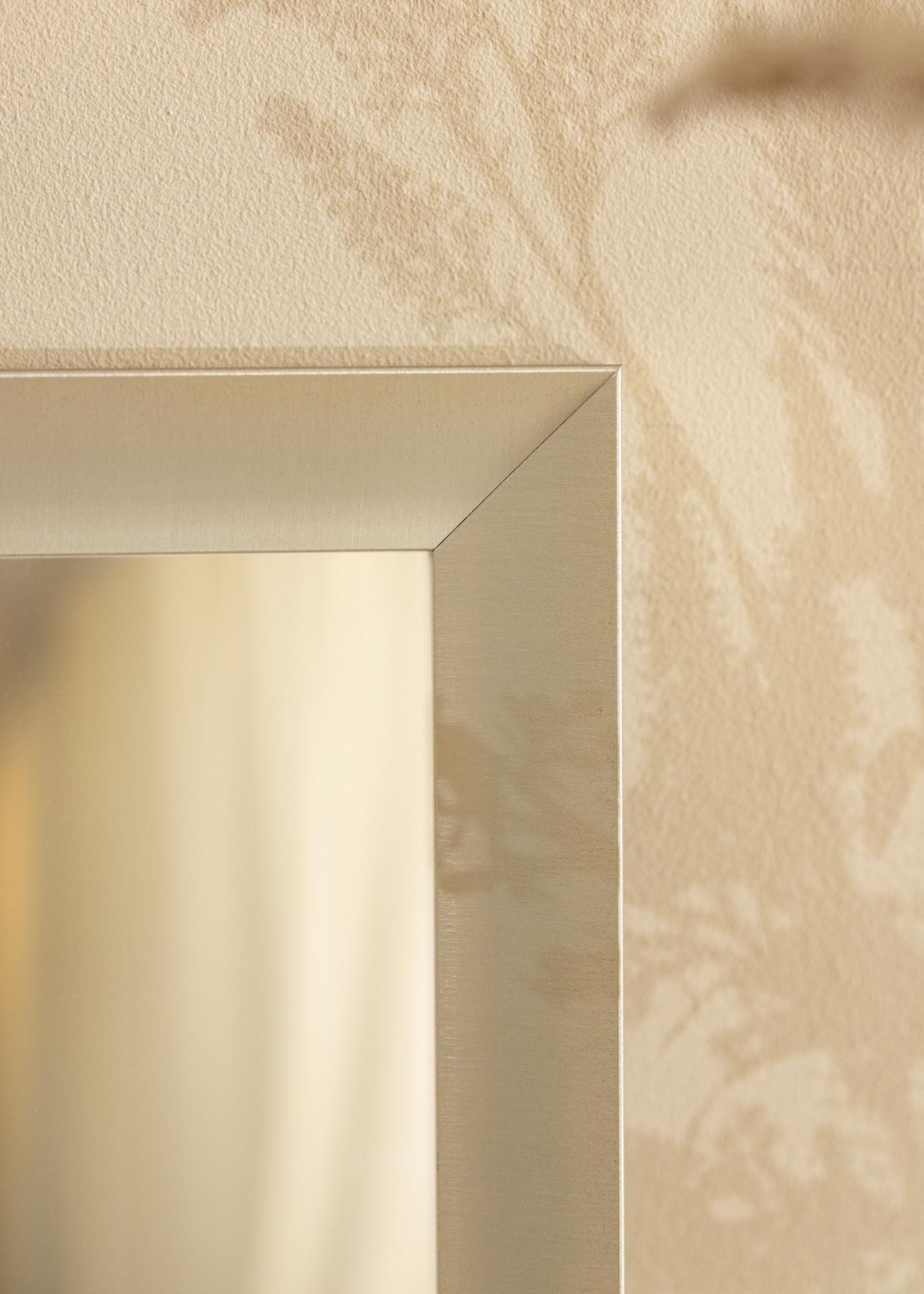 Eleganten zrcalo z diamantno obarvanim okvirjem z zaobljenim profilom, ki daje mehak vtis, izdelano visoke kakovosti iz aluminija. Nevtralna barva in čista oblika zrcala omogočata, da se prilega v katerikoli prostor in interier, vendar se najbolje obnese v kombinaciji s pastelnimi barvami. Obesite zrcalo skupaj z grafičnimi slikami in fotografijami s črnimi okvirji ter kombinirajte z dekoracijskimi elementi iz stekla ali črne barve, da ustvarite celoto v prostoru.