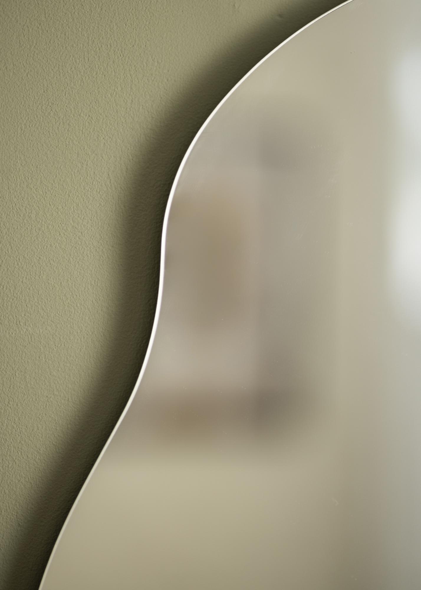Thin Cloud je tanka dolga ogledalo z edinstveno valovito obliko. Valovit dizajn ustvarja mehak izraz, ki se dobro ujema s pohištvom z ravnimi linijami, kot so mize, predalniki in knjižne police. To stensko ogledalo meri 40x80 cm in ga lahko pritrdite na svoje stene s pomočjo stenskega nosilca na hrbtni strani.