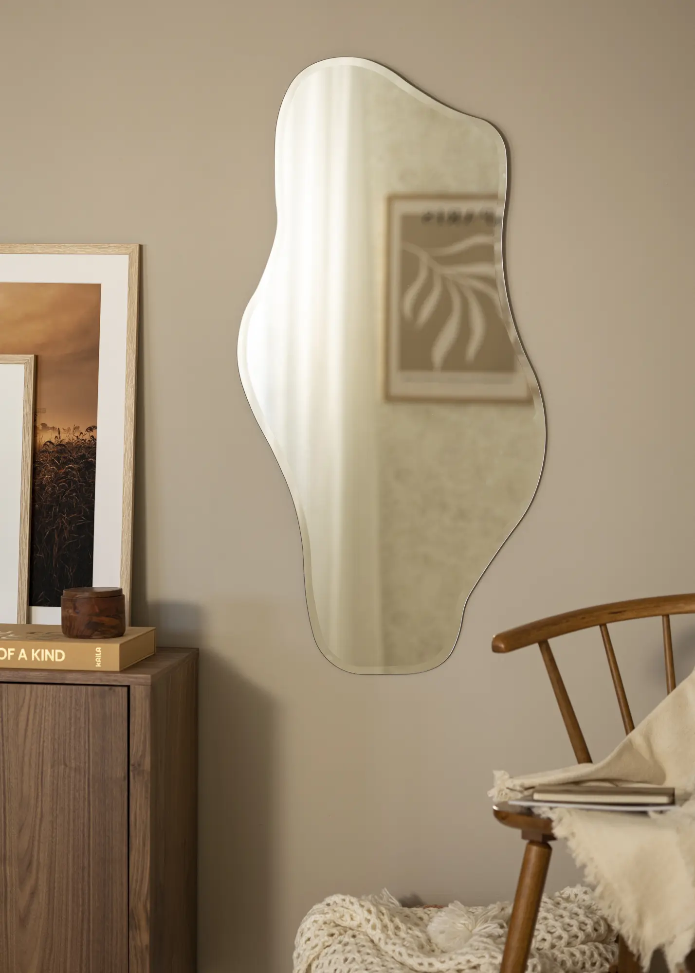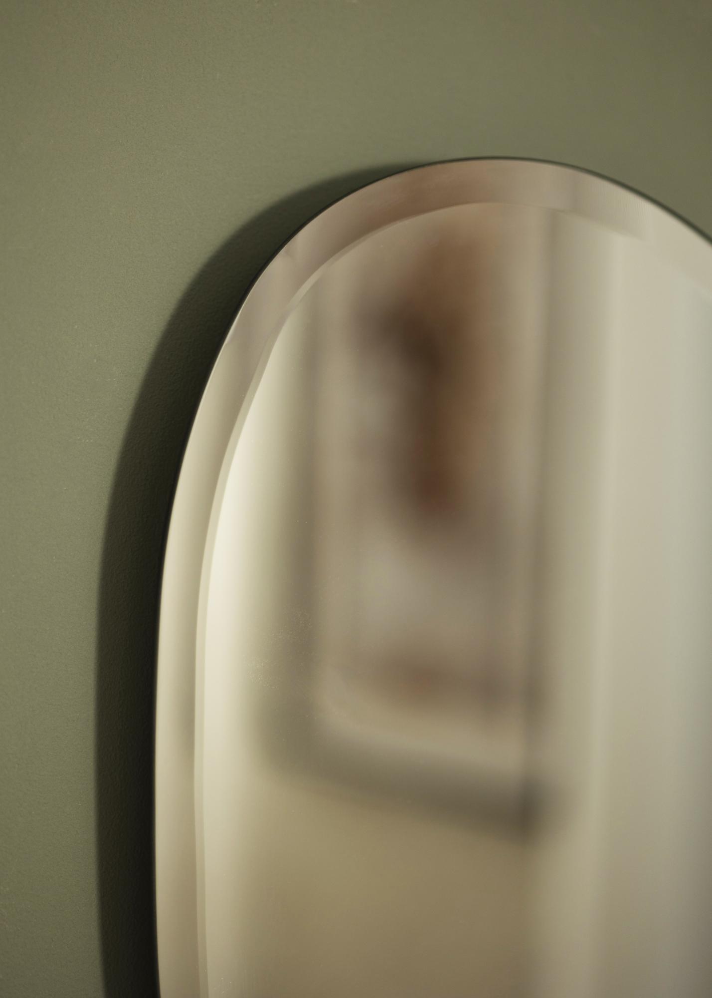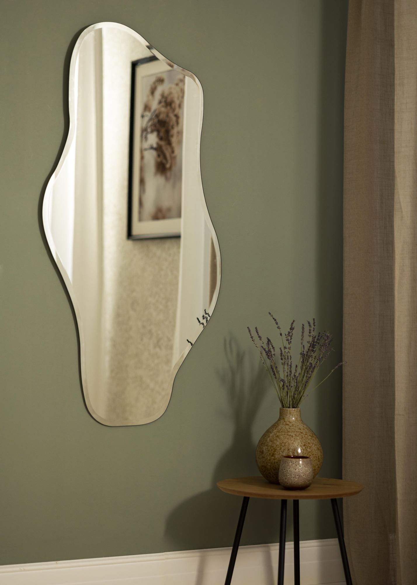 Odkrijte ogledalo, ki združuje funkcijo z edinstveno estetiko – ogledalo, ki ne odraža le vaše podobe, temveč tudi vaš občutek za slog. Z merami 55x110 cm je to ogledalo praktičen in eleganten oblikovalski element za vaš dom. Njegova zasnova je elegantna in tekoča, z izrazito organsko obliko, ki jo poudarja sofisticiran fasetno brušen rob, ki vsak prostor povzdigne.
