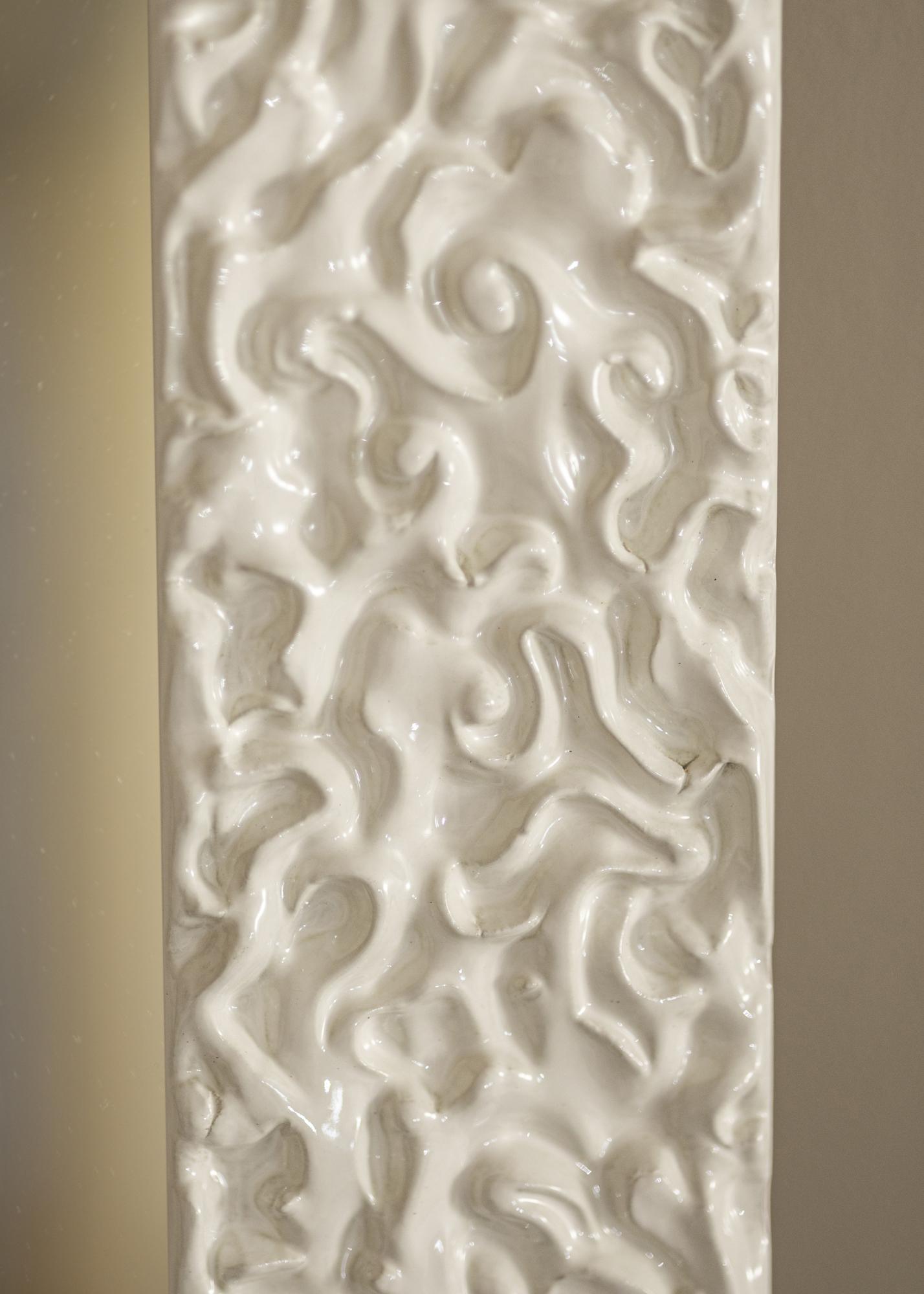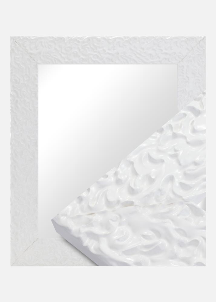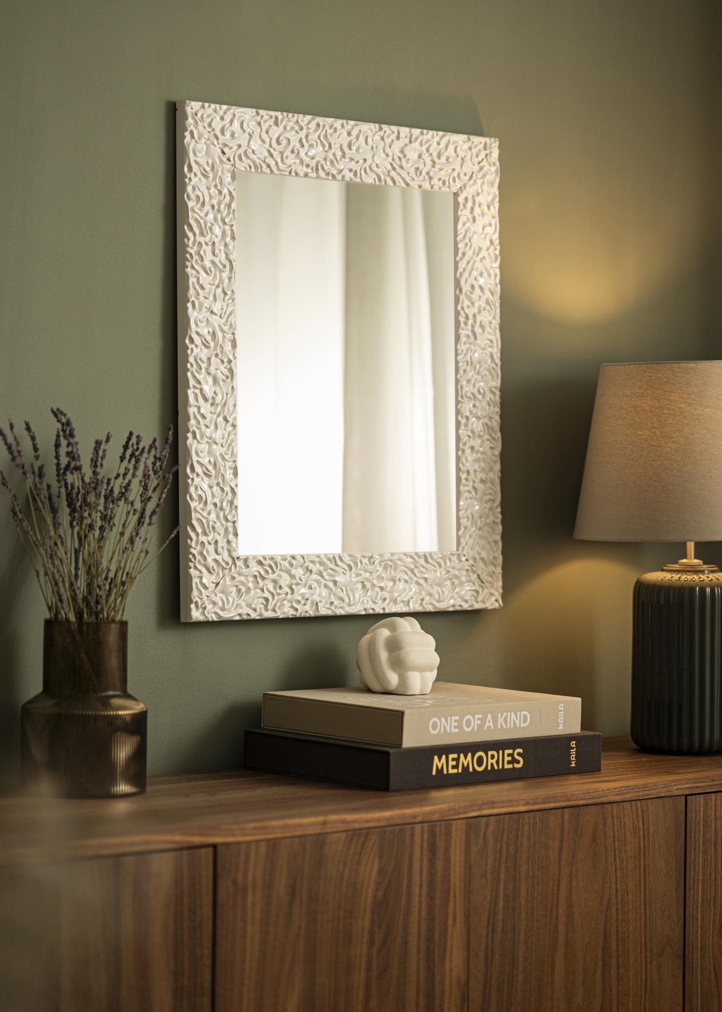 Zelo svetleča bela površina na ogledalu ima živahen, organski vzorec, ki ustvarja sodoben in eleganten občutek. Ta sijajni zaključek poudarja mehke, tekoče oblike in okvirju daje ekskluziven izraz. To je popolnoma rešitev za vas, ki iščete privlačen detajl, ki združuje klasično inspiracijo s sodobno zasnovo.