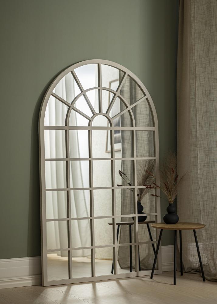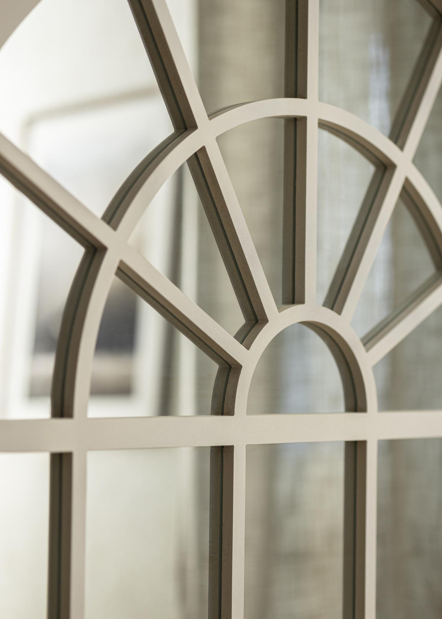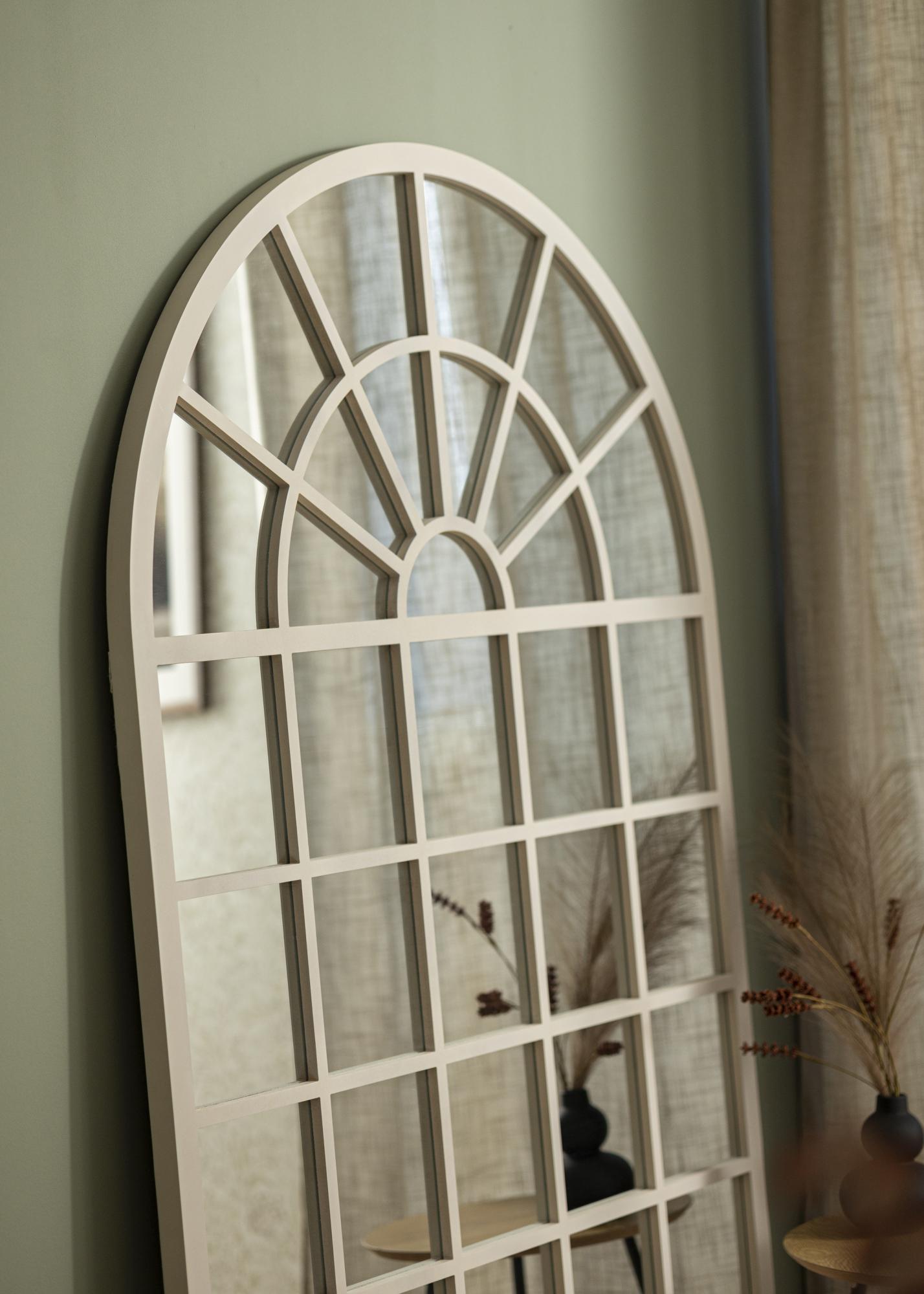 To ogledalo ima polkrožno obliko loka, ki ustvarja mehke linije in klasičen občutek, kar se dobro ujema s tradicionalnim ali vintage navdihnjenim notranjim slogom. Njegova edinstvena oblika ga naredi za umetniško delo samo po sebi in deluje prav tako dobro kot praktičen predmet kot dekorativni poudarek v vašem domu.