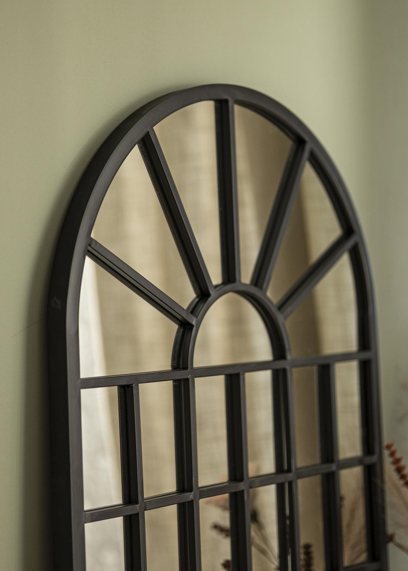 Črn kovinski okvir daje ogledalu značilen in moderen občutek, medtem ko obokana vrhnja stran doda pridih klasične elegance. Oblika ogledala spominja na tradicionalno okno, kar ustvarja iluzijo prostora in svetlobe v prostoru. Industrijski stil dopolnjujejo kovinske letve, ki razdelijo površino ogledala, kar ni le lep detajl, ampak tudi prispeva k močni konstrukciji ogledala.