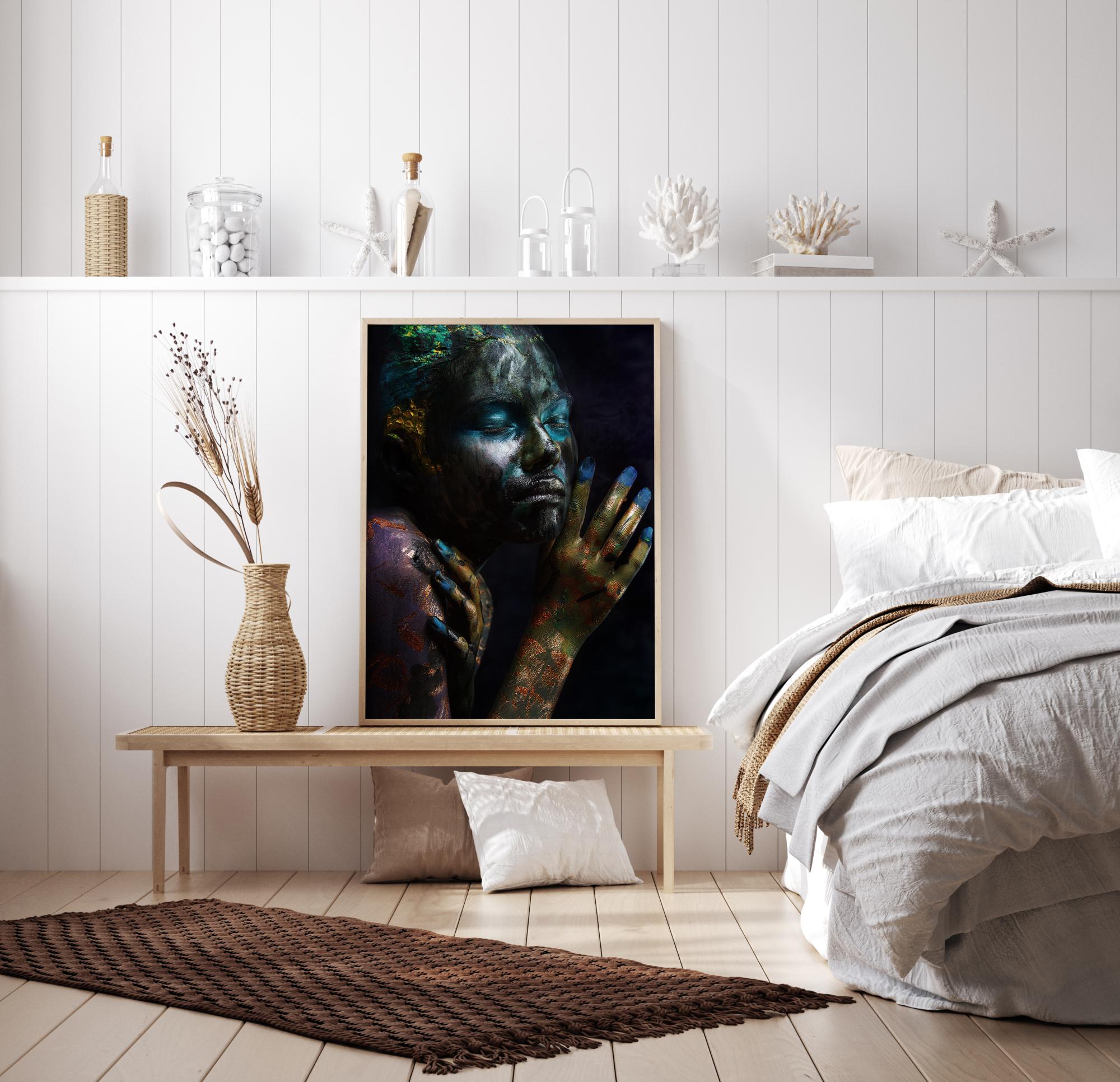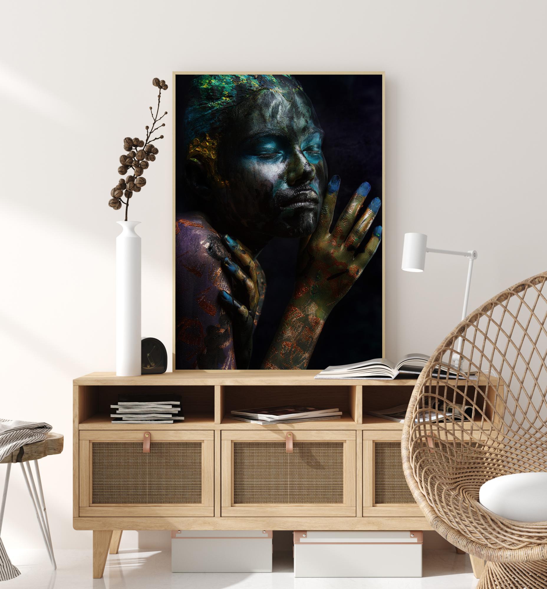 Osupljiv tisk ženske, pokrite z barvo. Na črni podlagi je ženska pokrita z barvitimi barvami. Z naravno svetlobo, ki osvetljuje obraz in ramena ženske, je poudarjena intenzivnost barv. Čudovit poster, ki lahko vnese barvo na belo steno.