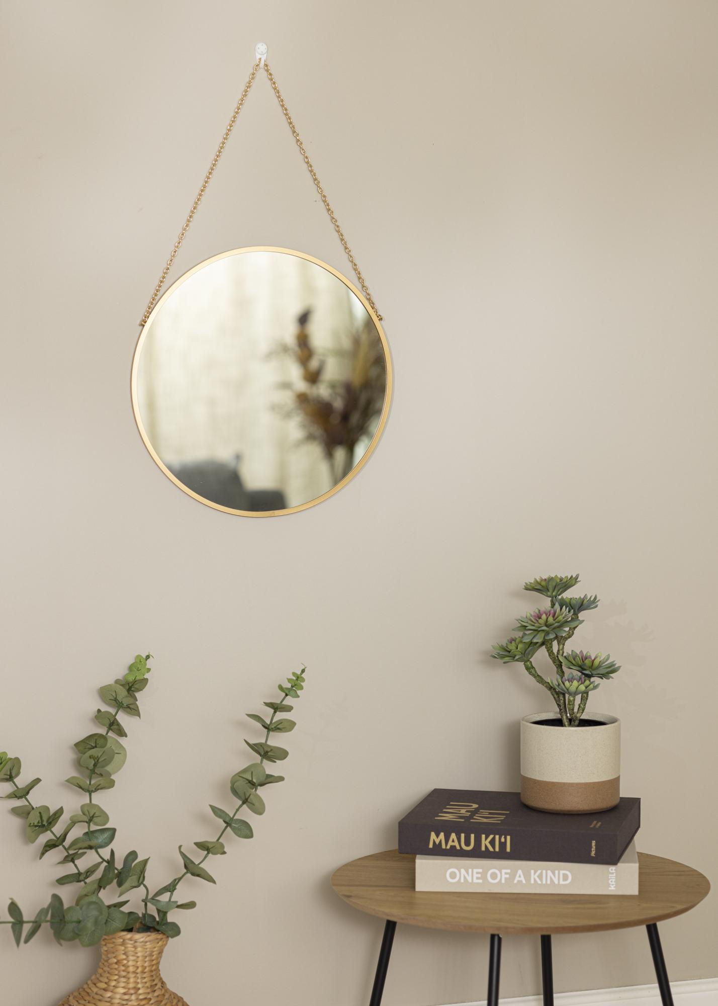 Naj ta stenska ogledala dodajo eleganco vašemu domu! Ogledalo ima sofisticiran videz z okroglo obliko in tankim okvirjem z globino samo 8 mm. Nežen okvir je izdelan iz kovine in ima ekskluzivno zlato barvo. Eleganten vtis dopolnjuje zlata veriga, ki se uporablja za obešanje.