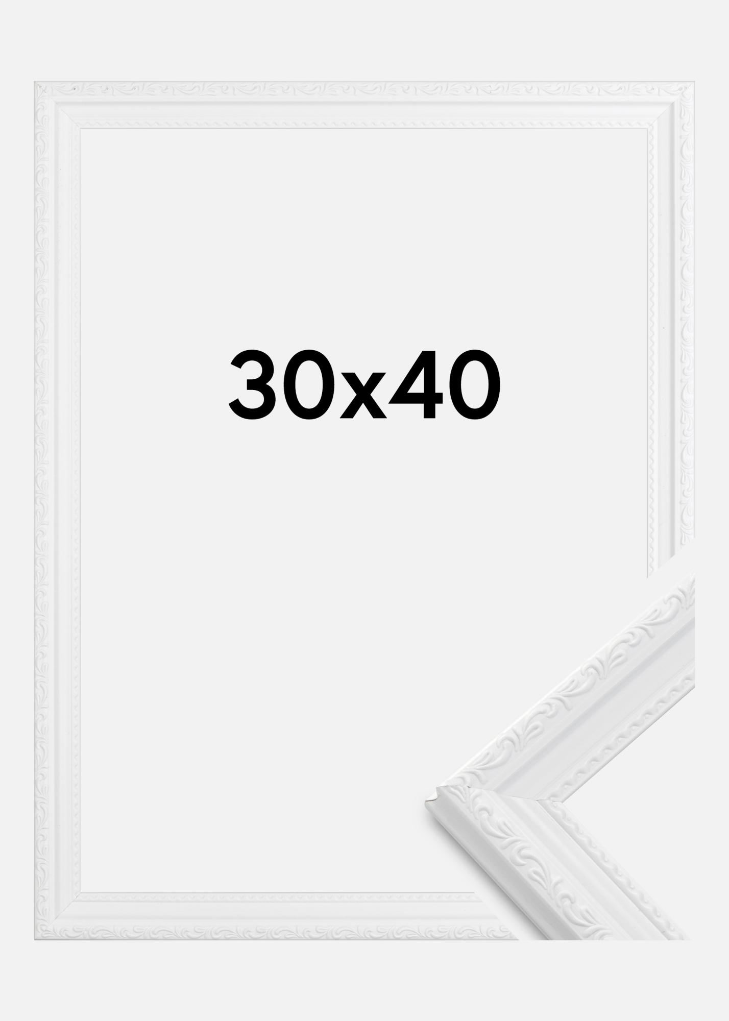 Začni izbiralec okvirja »Abisko Bela je eleganten okvir za fotografije v retro slogu z lepimi okraski. Zelo ustreza, ko iščete bel okvir v starejšem stilu.