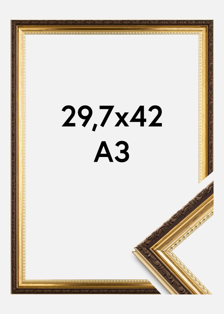 Iščete lepo okrašen okvir v starejšem slogu? Abisko Akrylno steklo Zlato je trden zlat okvir z izjemno elegantnimi okraski. Okvir je širok 25 mm in ima bleščečo zlato barvo z okrašeno rjavo obrobo na sredini. Tudi zlat del je okrašen, z valovitim vzorcem najbližje steklu.