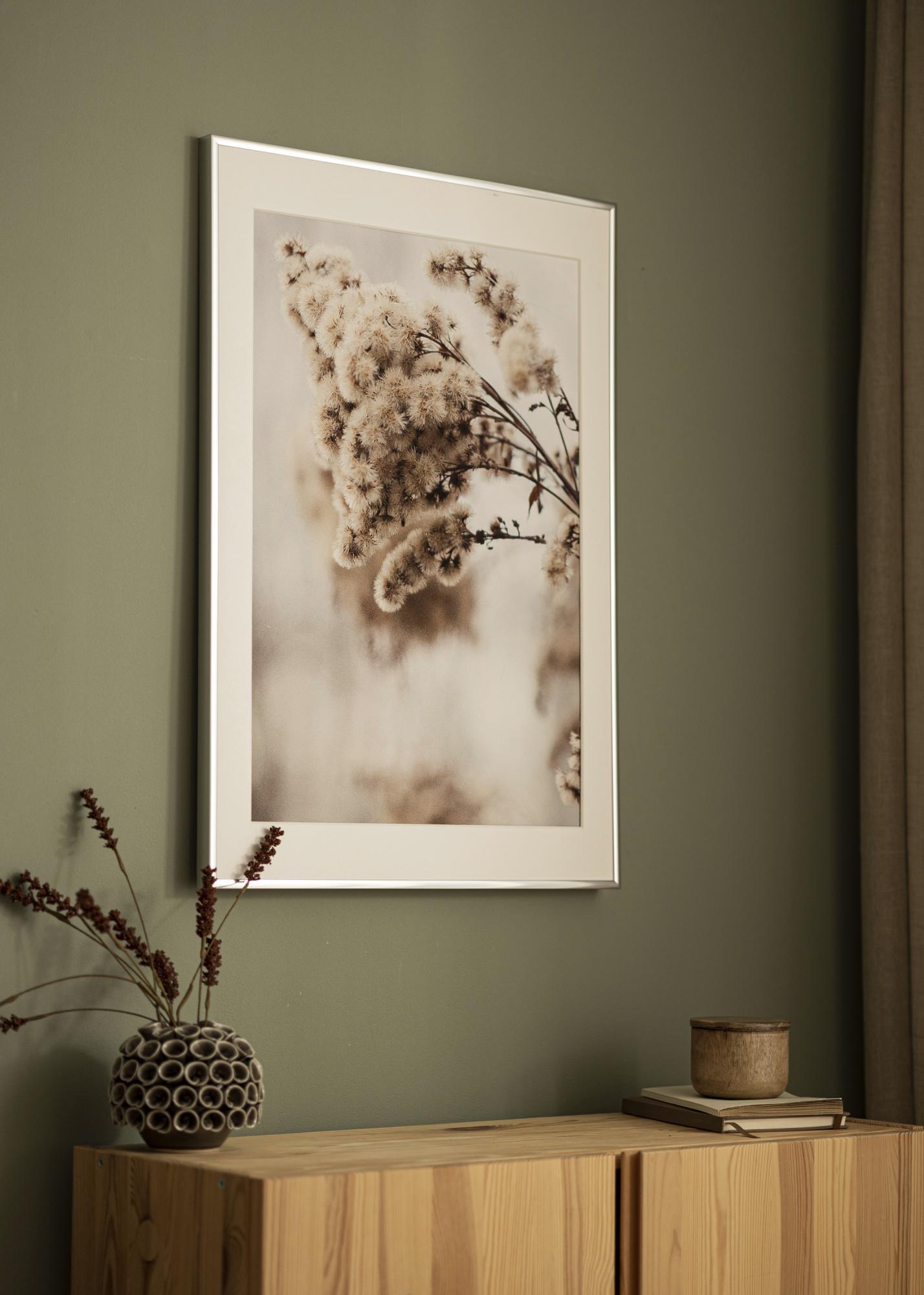 Ta srebrni okvir ni le eleganten element opreme, ampak je tudi praktičen. Opremljen je s kristalno čistim in nezlomljivim akrilnim steklom, ki učinkovito ščiti vaš motiv. Akrilno steklo ima zaščitno folijo na obeh straneh, da zagotovi brezhibnost ob dostavi - ne pozabite odstraniti folije pred uporabo.