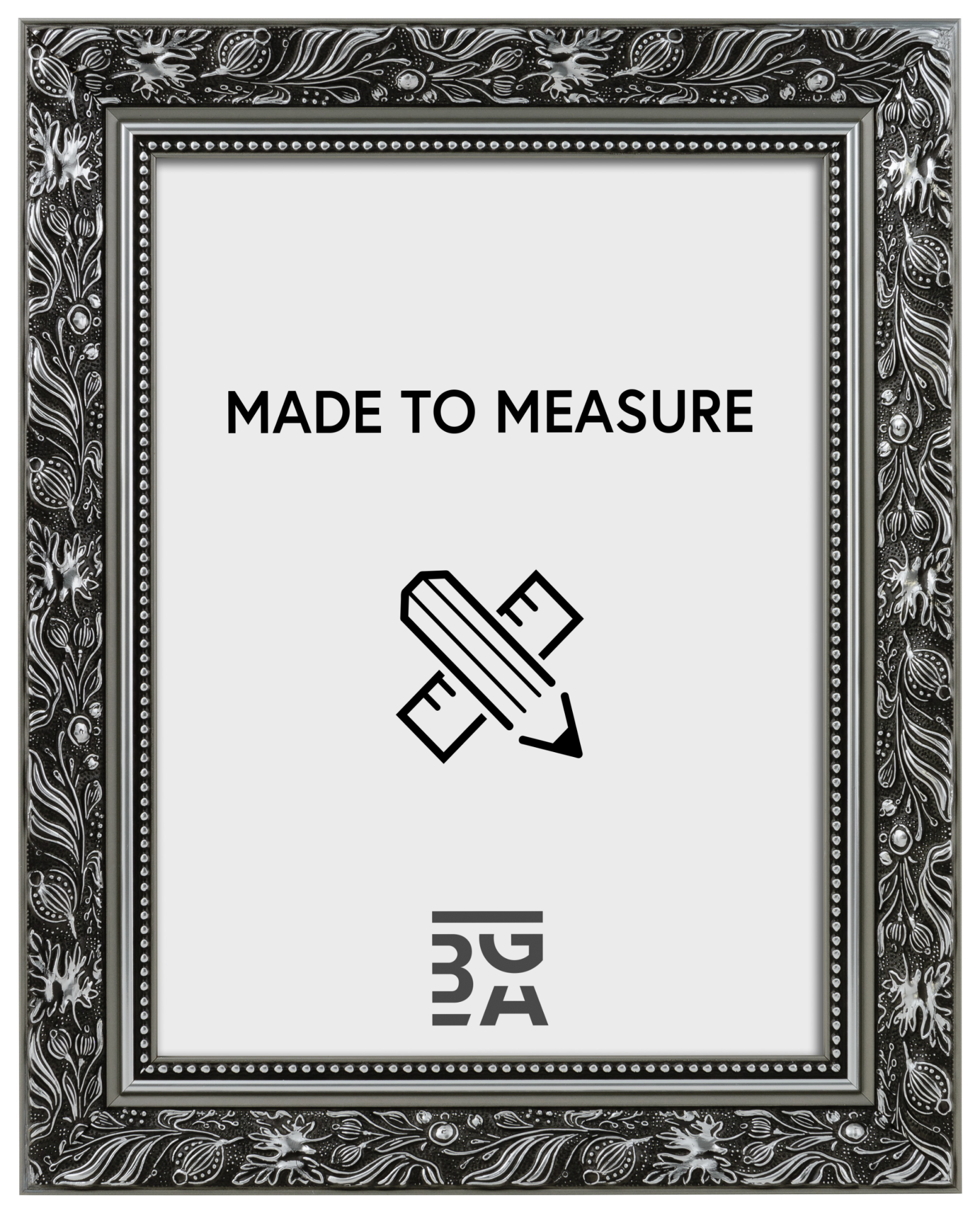 Dodajte steni pridih luksuza, hkrati pa pritegnite dodatno pozornost na svojo sliko! Ta čudovit okvir ima dvojni profil, ki na steni izgleda zelo lepo. Robovi so v celoti srebrni, medtem ko je sprednja stran črna in ima srebrni vzorec z listi in vijugastimi oblikami. Najbližje steklu poteka srebrna črta in črn del s srebrnim bisernim vzorcem. Ker je okvir izdelan po vaših dimenzijah, ste lahko prepričani, da se prilega točno tja, kjer ga želite.