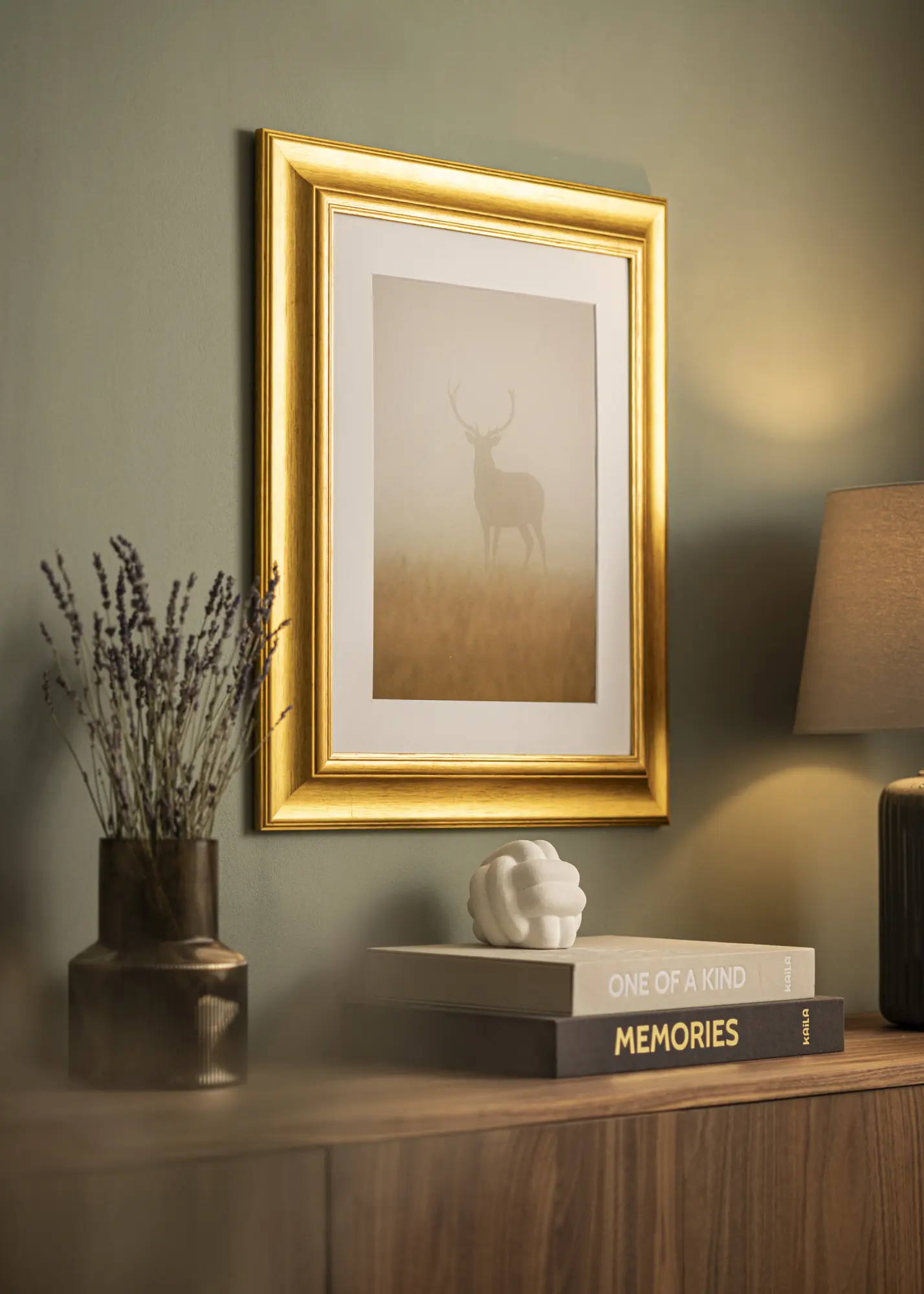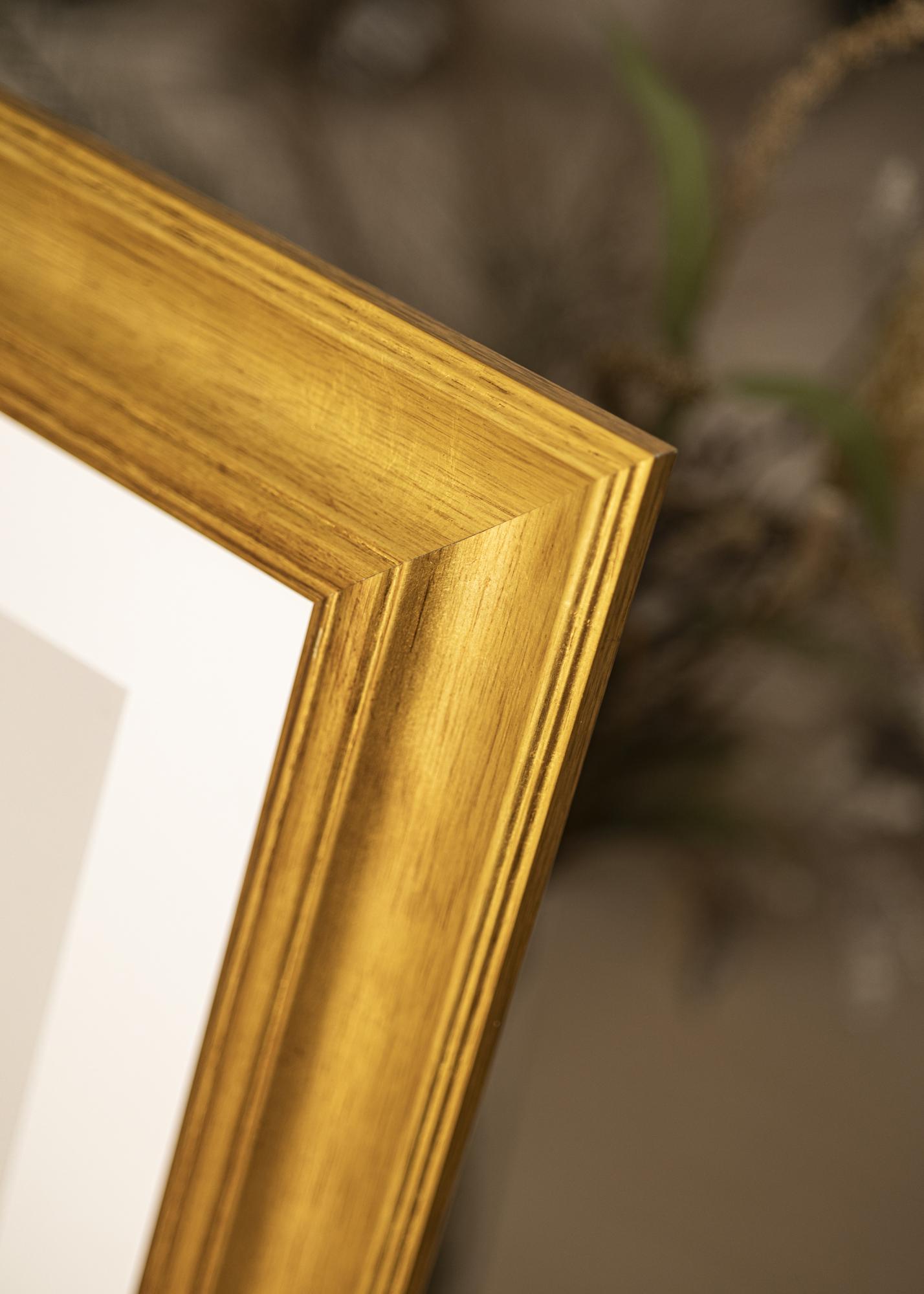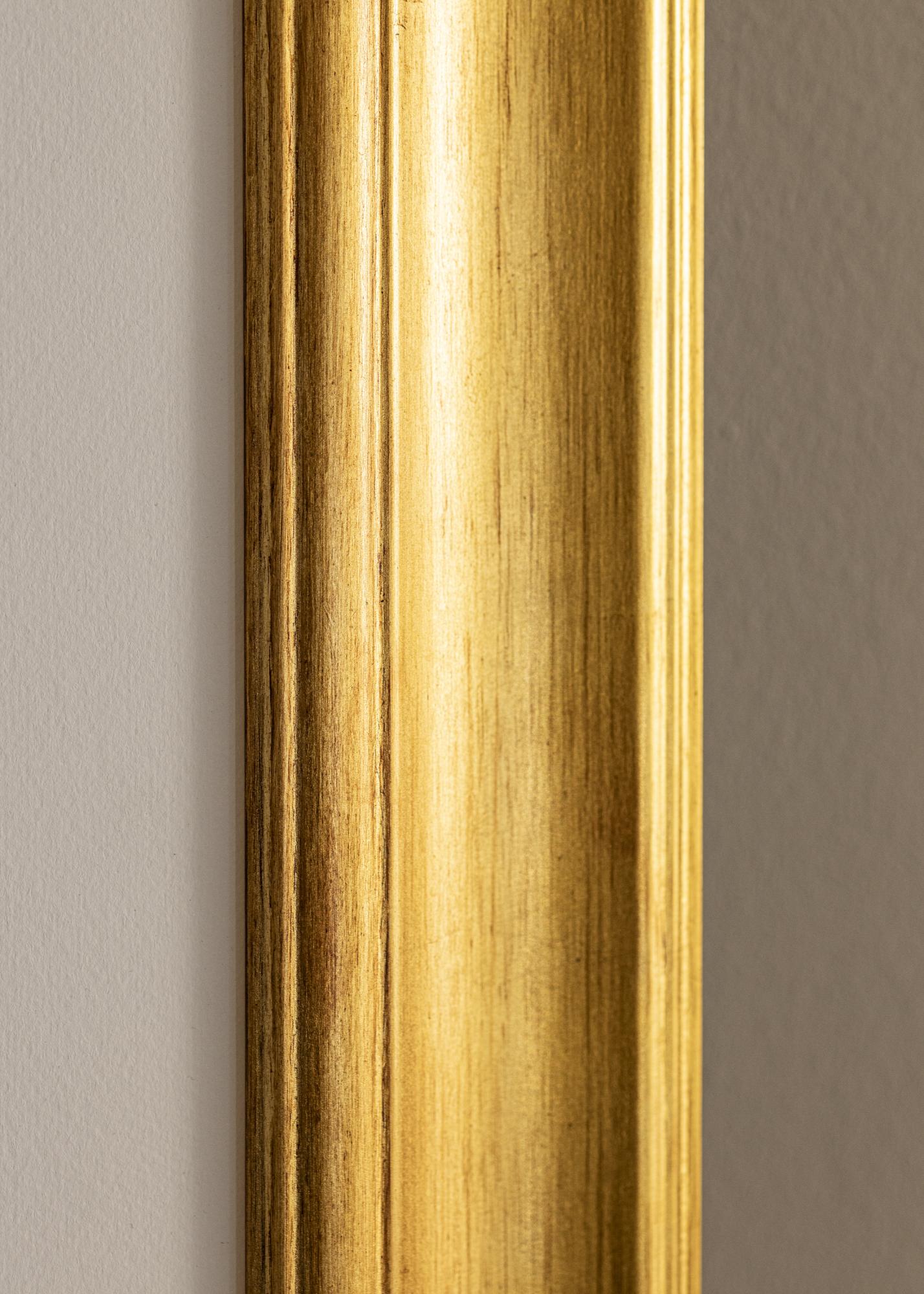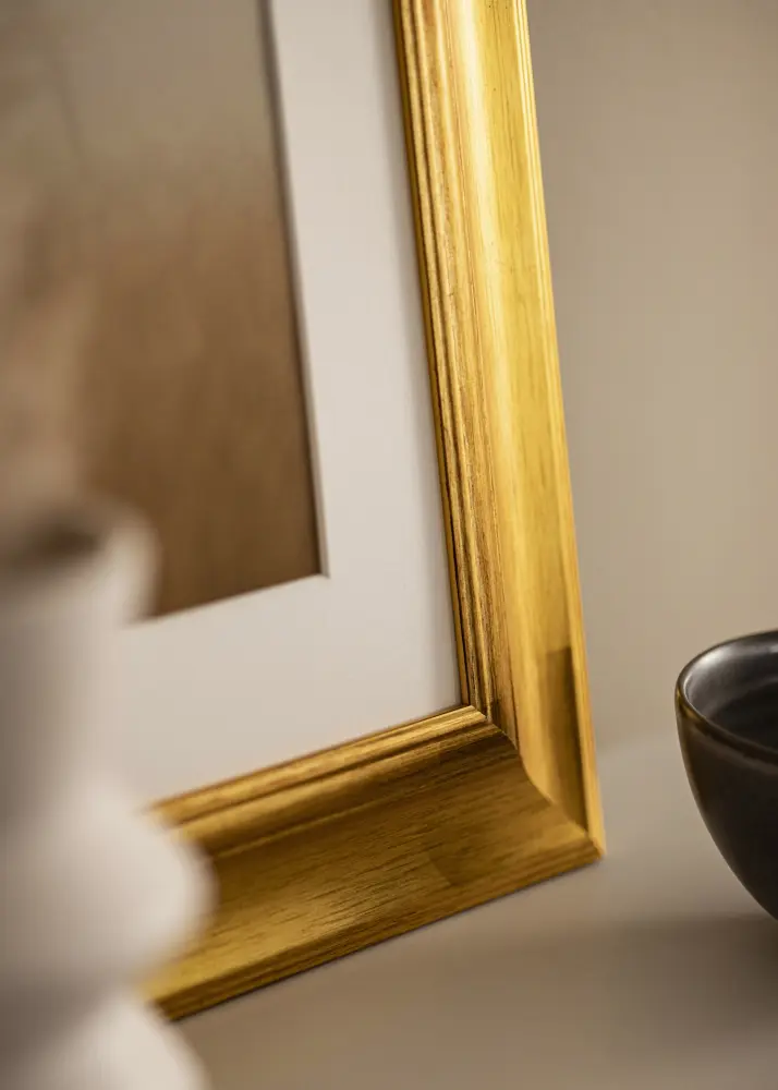 Krtačena površina okvirja ima subtilne spremembe, ki ustvarjajo rahlo patinirano občutek, kar dodaja dodatno dimenzijo vaši notranjosti. Tanke linije vzdolž robov prispevajo k prefinjeni podrobnosti, medtem ko topli zlat ton krepi klasični izraz okvirja. To ga naredi za odlično izbiro tako za moderne kot tradicionalne okolje.