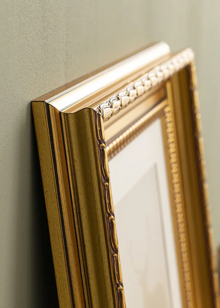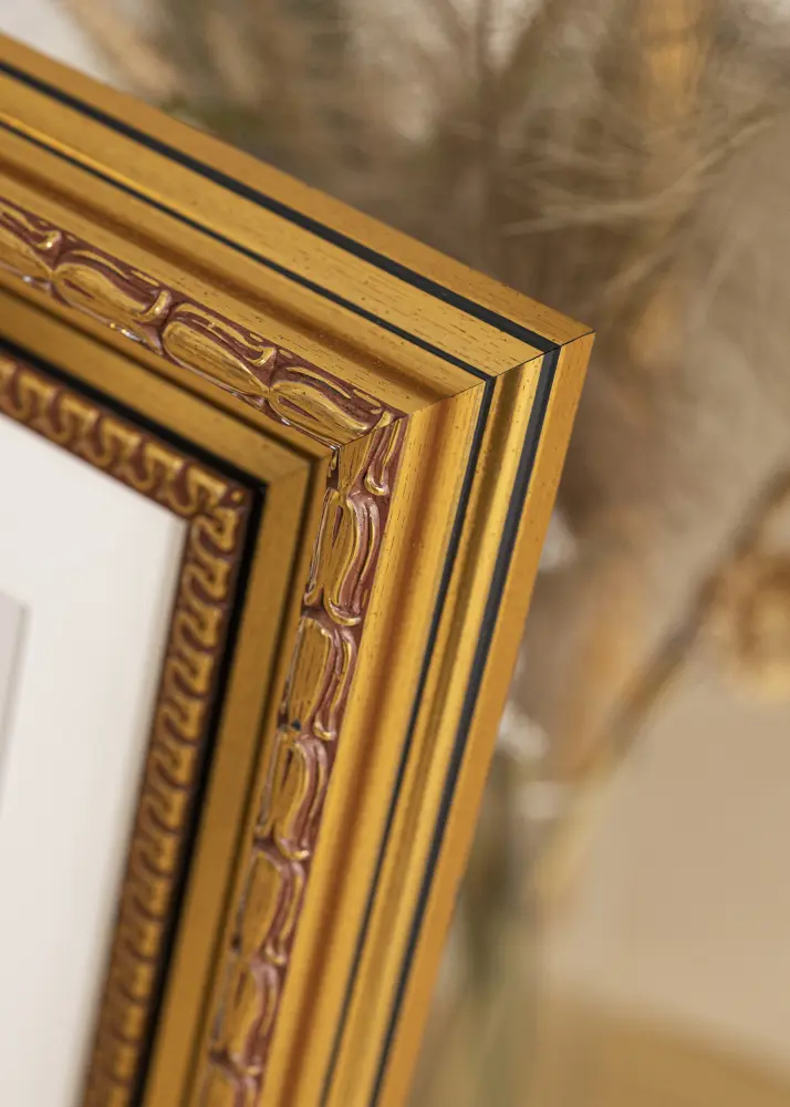 Birka je zlato okvir, ki si ga z veseljem ogledate dlje časa. S svojim širokim profilom in čudovitimi okraski je to okvir, ki ustreza, ko iščete nekaj resnično spektakularnega. Okvir je izdelan v naši lastni delavnici za okvire, kar nam omogoča, da jamčimo za kakovost, ki presega običajno!