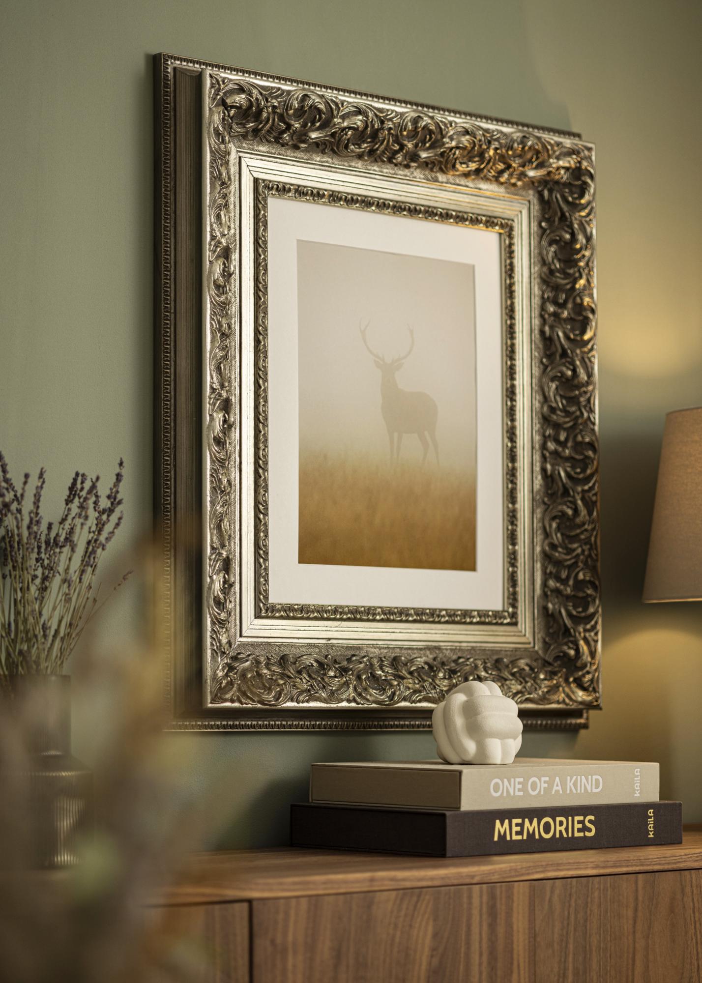 Ta bogato okrašen okvir v starinskem srebru ima kompleksne detajle in čudovito patino, ki daje občutek elegance in brezčasnosti. Globok relief poudarja izklesane vzorce listov, kar ga naredi za popolno izbiro za klasične motive in okvirjanje, ki zahteva edinstven in dekorativen okvir za slike.