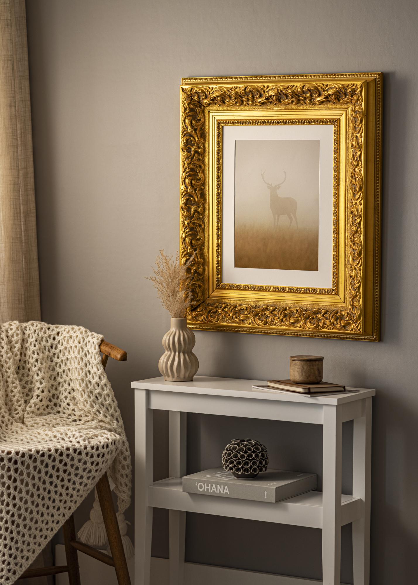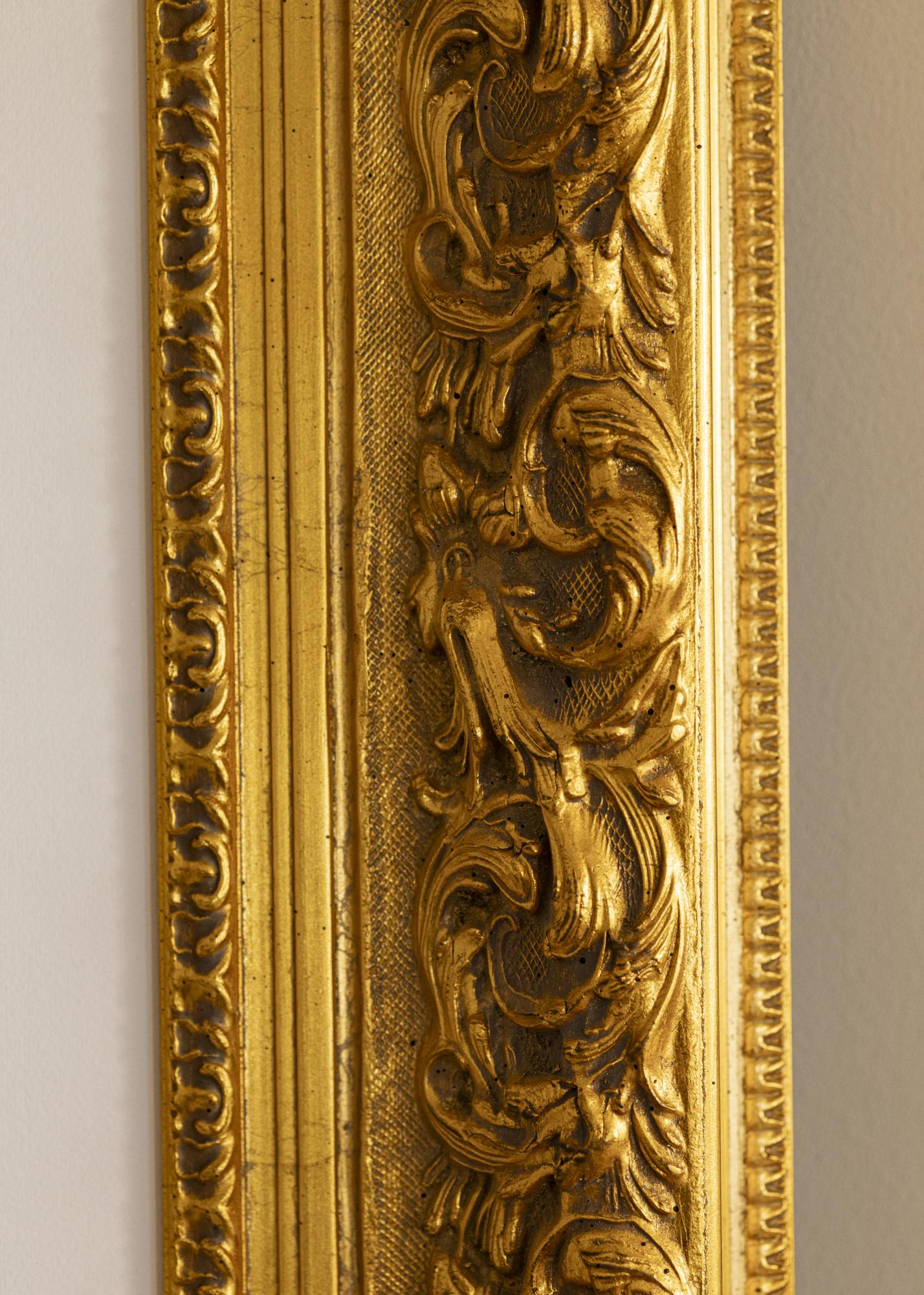 Okrašeni okvir krasi vijugasti okraski in izklesani listnati vzorci, kar ustvarja brezčasen videz. Fina biserna bordura poteka vzdolž notranjega roba, medtem ko strukturirana površina zagotavlja starinski občutek. Končna obdelava ima rahlo patino, ki poudarja podrobne okraske, zaradi česar je ta okvir za slike umetniško delo samo po sebi.