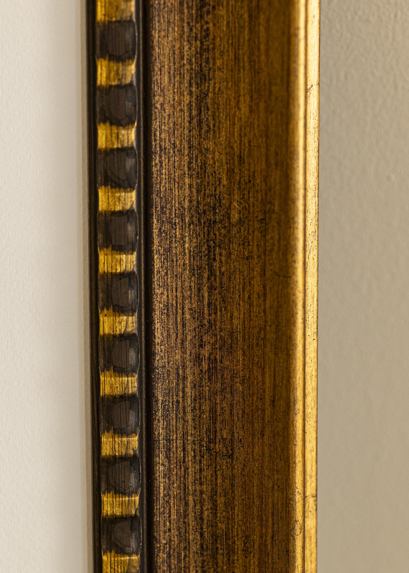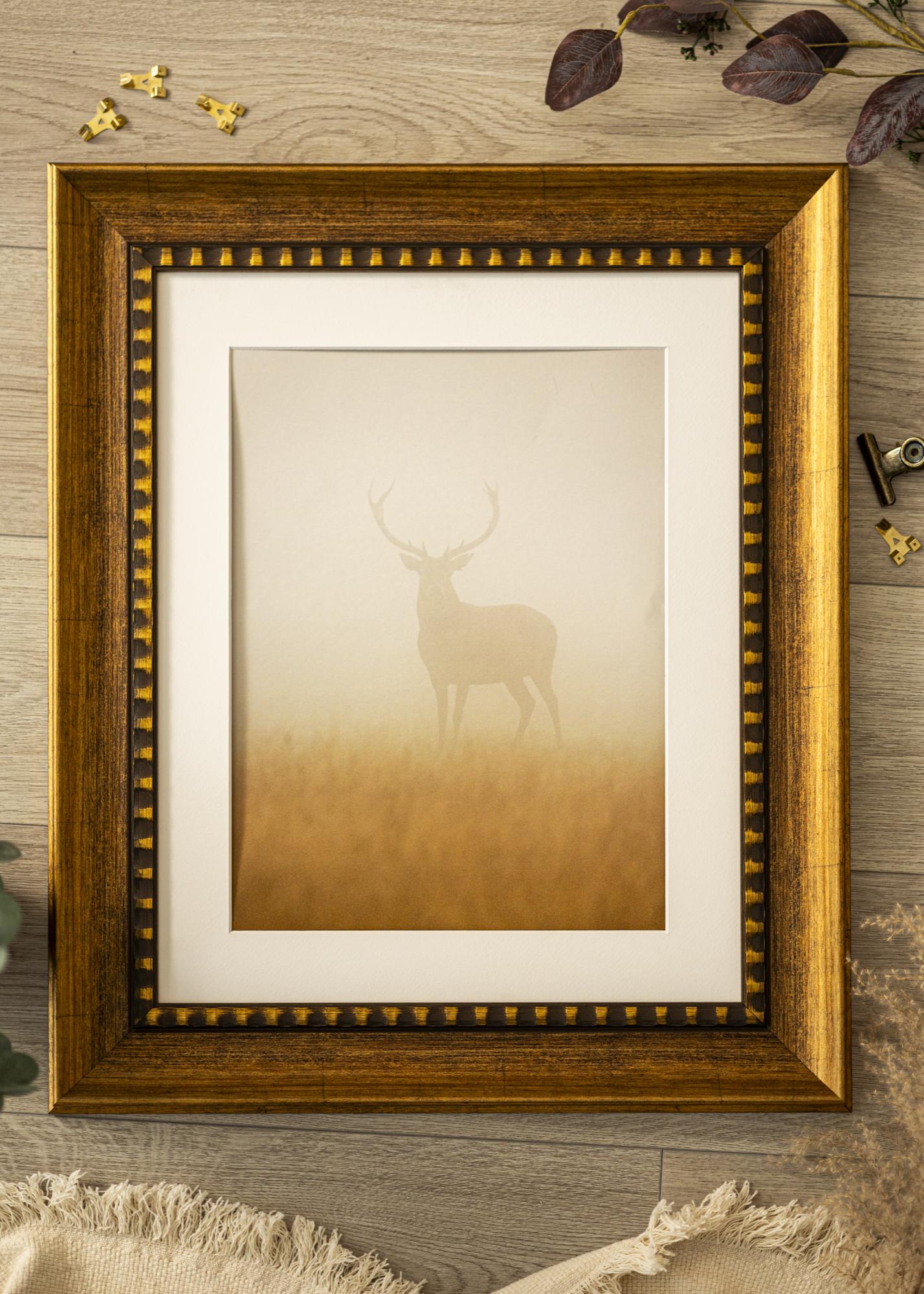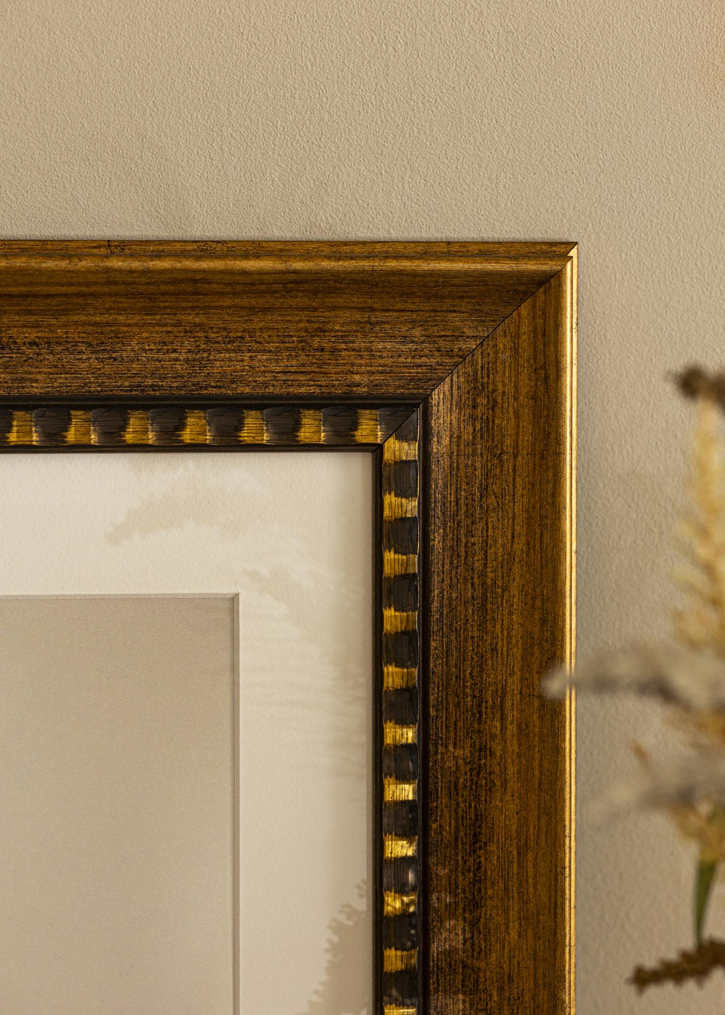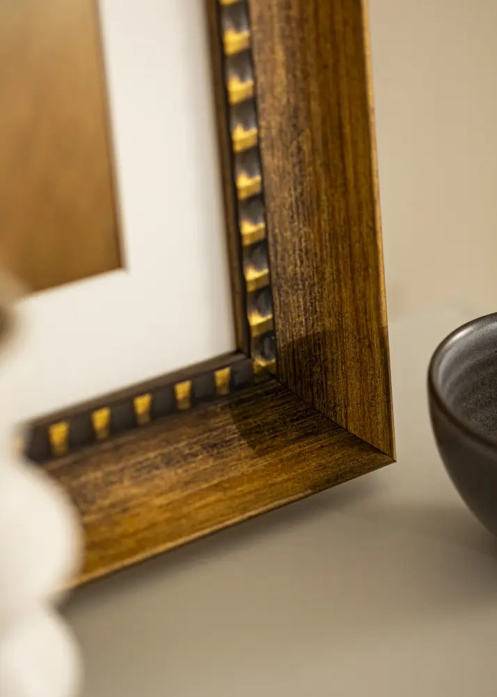 75 mm široka letvica okvirja ima subtilen sijaj in je okrašena z izrazito črtasto podrobnostjo v zlati in črni barvi vzdolž notranjega roba. To daje okvirju edinstven značaj in ga naredi popolnega za poudarjanje klasičnih in tradicionalnih umetnin. Struktura lesa je vidna in prispeva k rustikalnemu občutku, medtem ko mehki zlat rob dodaja pridih elegance.