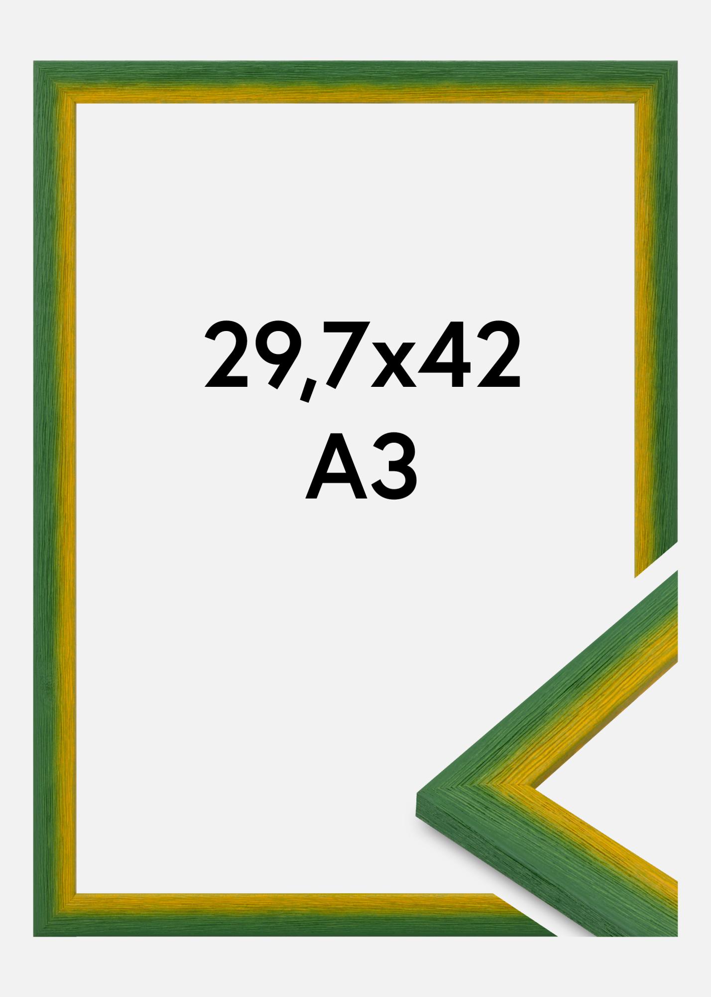 Ta fotorama v velikosti 29,7x42 cm je popolna kombinacija sodobnega dizajna in naravne lepote. S svojo gladko površino in harmonično mešanico zelenih in zlato rumenih tonov elegantno poudari naravno strukturo lesa. Ozek profil, z okvirno letvijo široko 23 mm in globino 13 mm, daje prefinjen in umirjen videz, ki omogoča, da vaš motiv pride do izraza.
