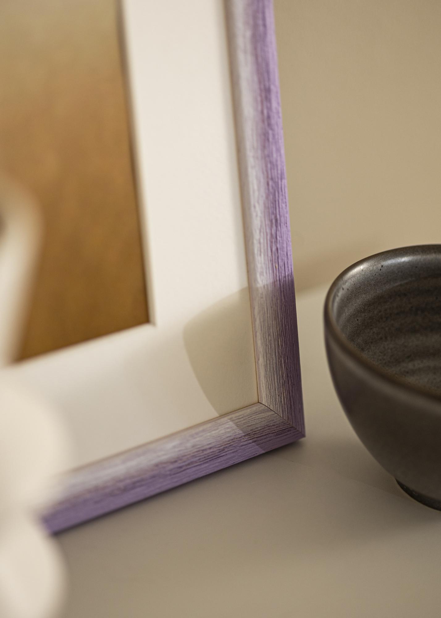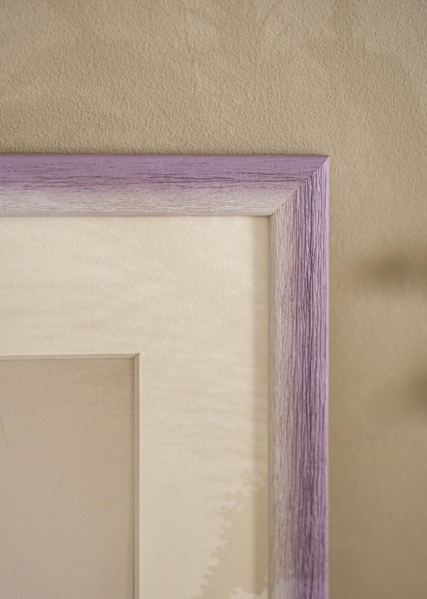 Okvir je izdelan iz lesa ayous in ima mehak prehod barve iz skoraj koščenega tona v nežno sivkin vijolični odtenek. Izrazita lesena struktura z vertikalnimi zrni daje naraven in rustikalen občutek, medtem ko ročno pobarvan učinek ustvarja subtilno in živahno globino v barvni shemi. Površina ima mat finish, ki krepi harmonično in mirno barvno paleto.