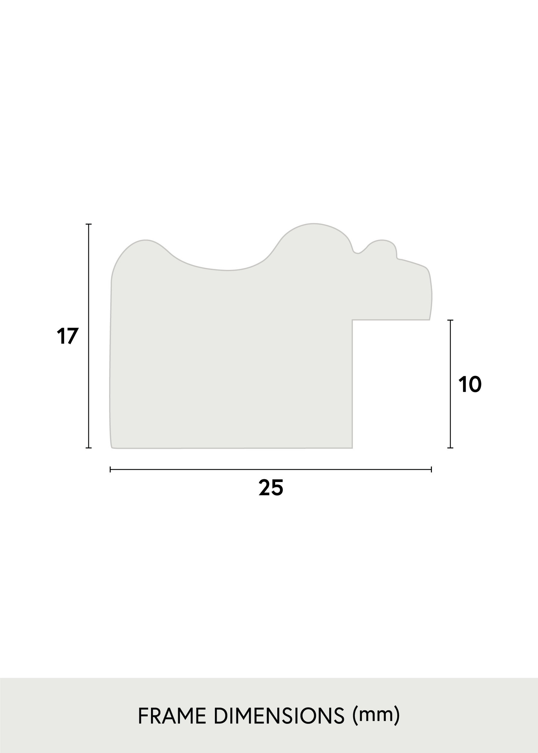 25 mm širok okvir v kombinaciji z globino 17 mm daje okvirju robusten in trden občutek. Izdelan iz lesa, ta okvir po meri ponuja trajnost in estetiko. Bogato okrašeni ornamenti poudarjajo starinski slog in poskrbijo, da okvir odlično ustreza tako klasičnim kot modernim okoljem.