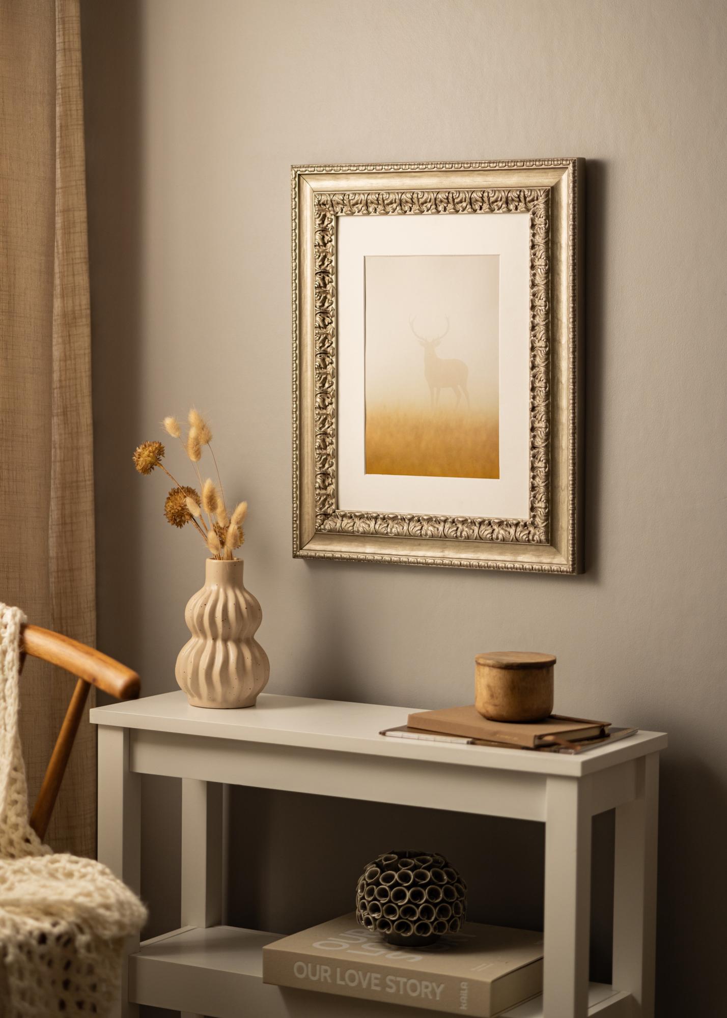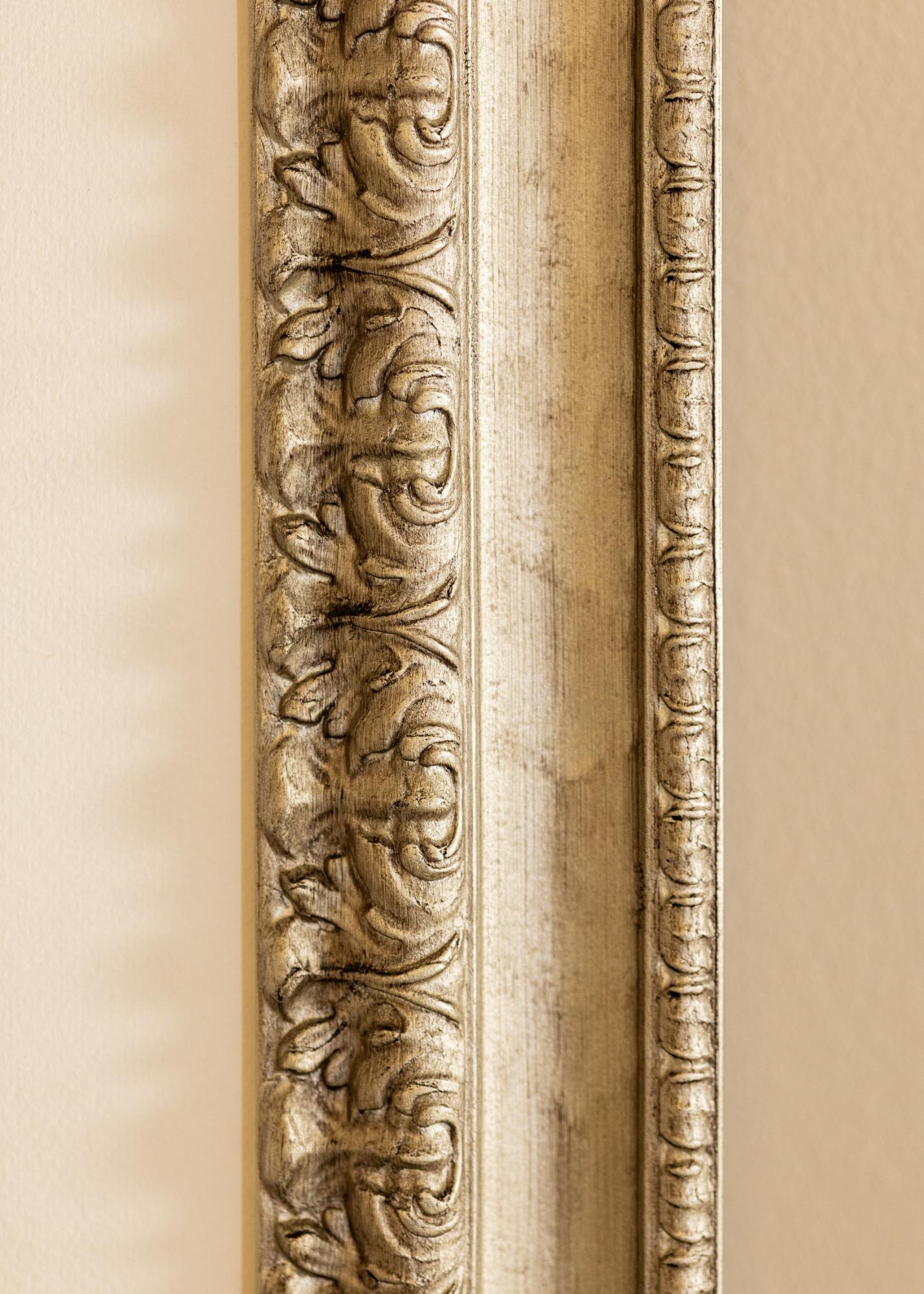 Izdelan iz lesa, ima ta okvir za slike antik zlati ton z rahlo patinirano površino, ki poudarja njegov klasičen videz. Detajlirani okraski v relieju vzdolž notranjega roba dajejo eleganten izraz in ustvarjajo občutek časovnosti. Krtačeni zaključek poudarja dekoracijo in ustvarja subtilen starinski učinek, ki dodaja značaj in šarm vsakemu uokvirjenemu predmetu.