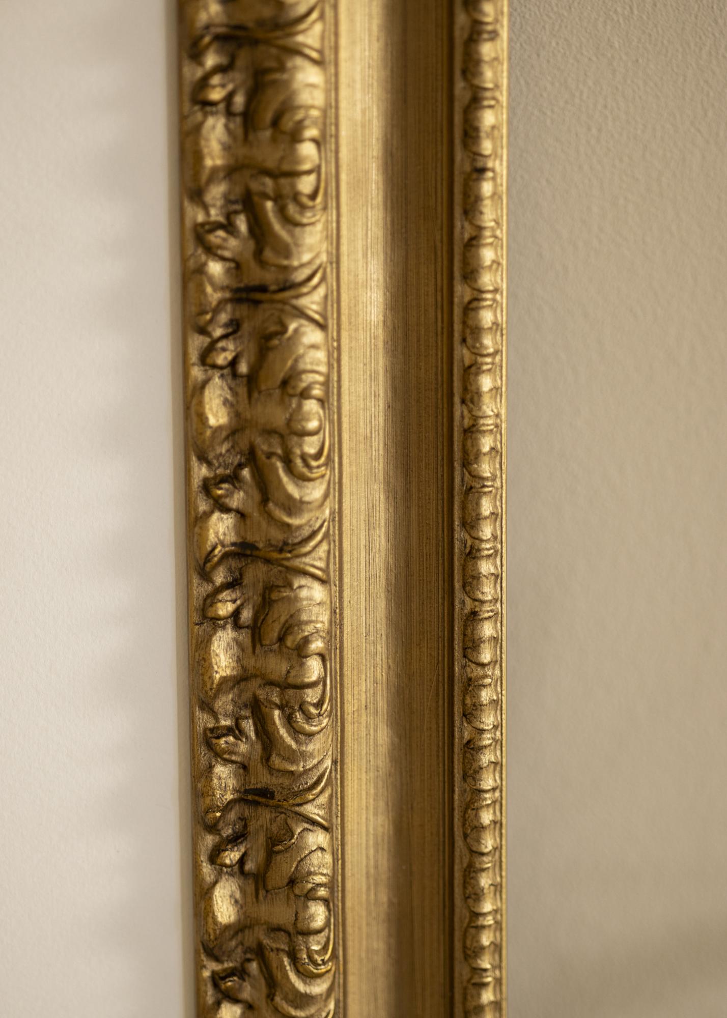 Okvir Drottningholm Zlato III je eleganten in stilski okvir za fotografije, ki vašim slikam daje kraljevsko obrobo. S svojim zlatim zaključkom in podrobnim, skulpturiranim okrasjem vzdolž notranjega roba, ta okvir za slike postane čudovit dodatek kateremukoli prostoru. Mehko ščetkanje površine poudari reliefni vzorec in okvirju doda rahlo staran značaj, ki ustvarja občutek brezčasne elegance.