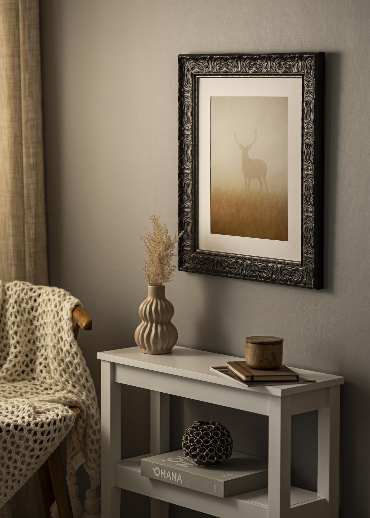 Z širokim okvirjem 70 mm in globino 35 mm, Okvir Durham Črna ponuja robustno in impresivno obrobo. Izdelan iz bora, ta okvir združuje trpežnost z estetiko, zaradi česar je odlična izbira tako za sodobne kot tradicionalne notranje prostore. Podrobna oblikovanje okvirja daje edinstven dotik, ki privlači poglede, ne da bi preplavilo motiv.