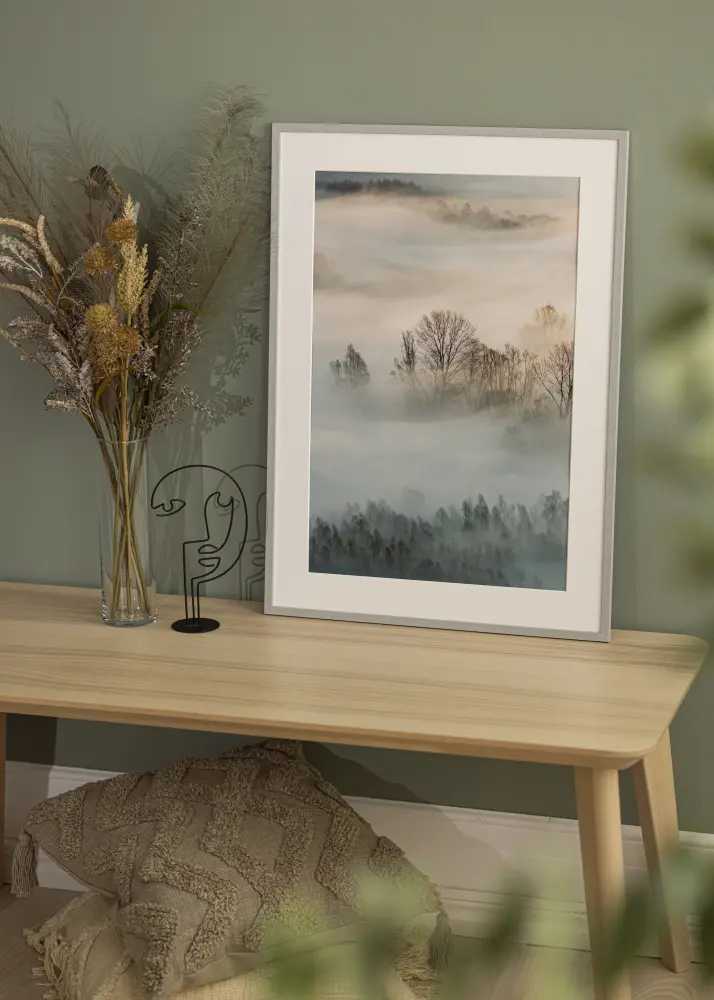 Okvir ima matirano površino, ki daje prefinjen občutek in se dobro ujema z različnimi stili notranje opreme. Opremljen je tudi s praktičnimi kovinskimi obešali na zadnji strani, kar omogoča enostavno obešanje slike bodisi horizontalno ali vertikalno, prilagojeno glede na orientacijo slike in vaše osebne preference.