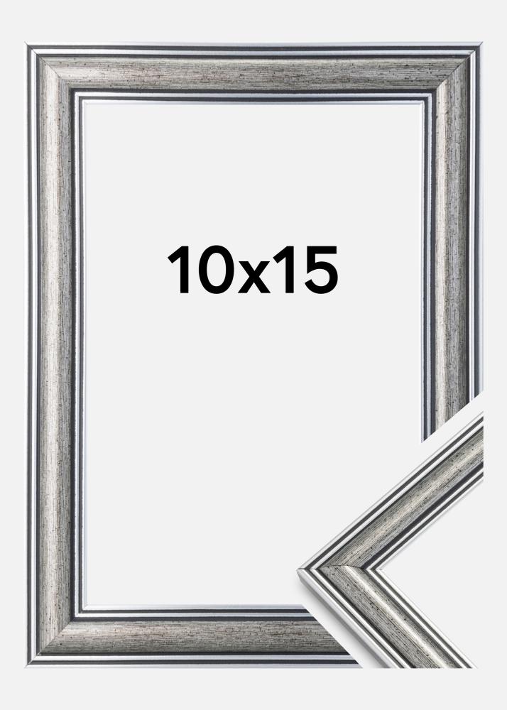 Začni izbiralec okvirja »Frigg je srebrni okvir s črnimi linijami in črnimi lisami. Odlično se prilega, ko iščete širok tradicionalen srebrni okvir, ki ustreza mnogim vrstam slik in okolij.