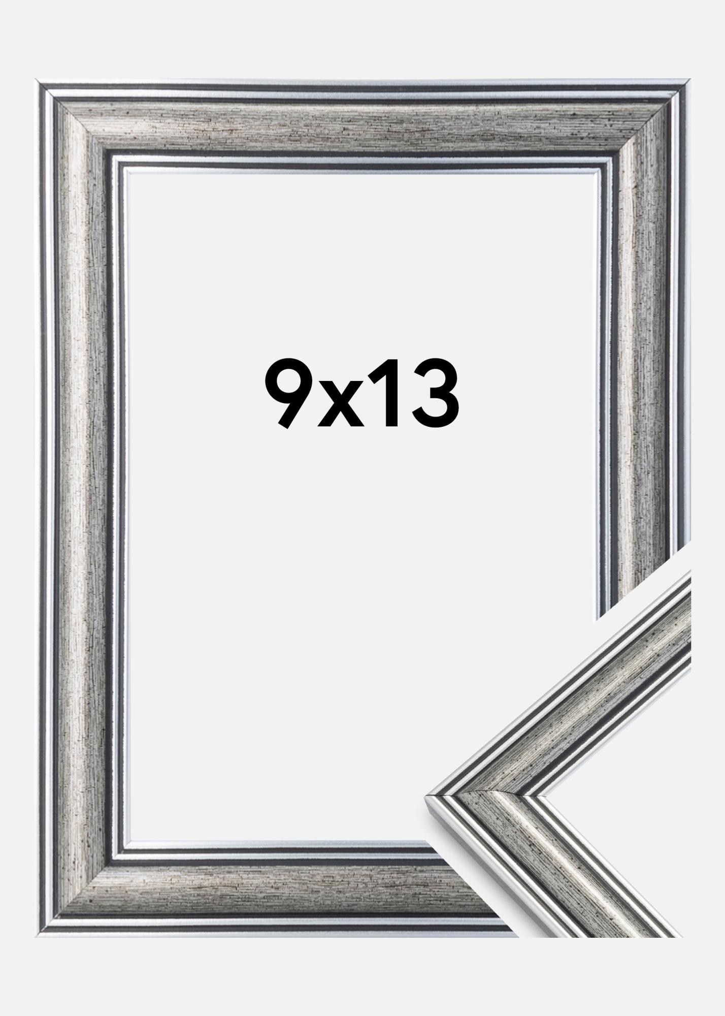 Frigg je srebrni okvir s črnimi črtami in črnopegastimi dodatki. Odlično se prilega, ko iščete širok tradicionalni srebrni okvir, ki ustreza različnim vrstam slik in okolij.