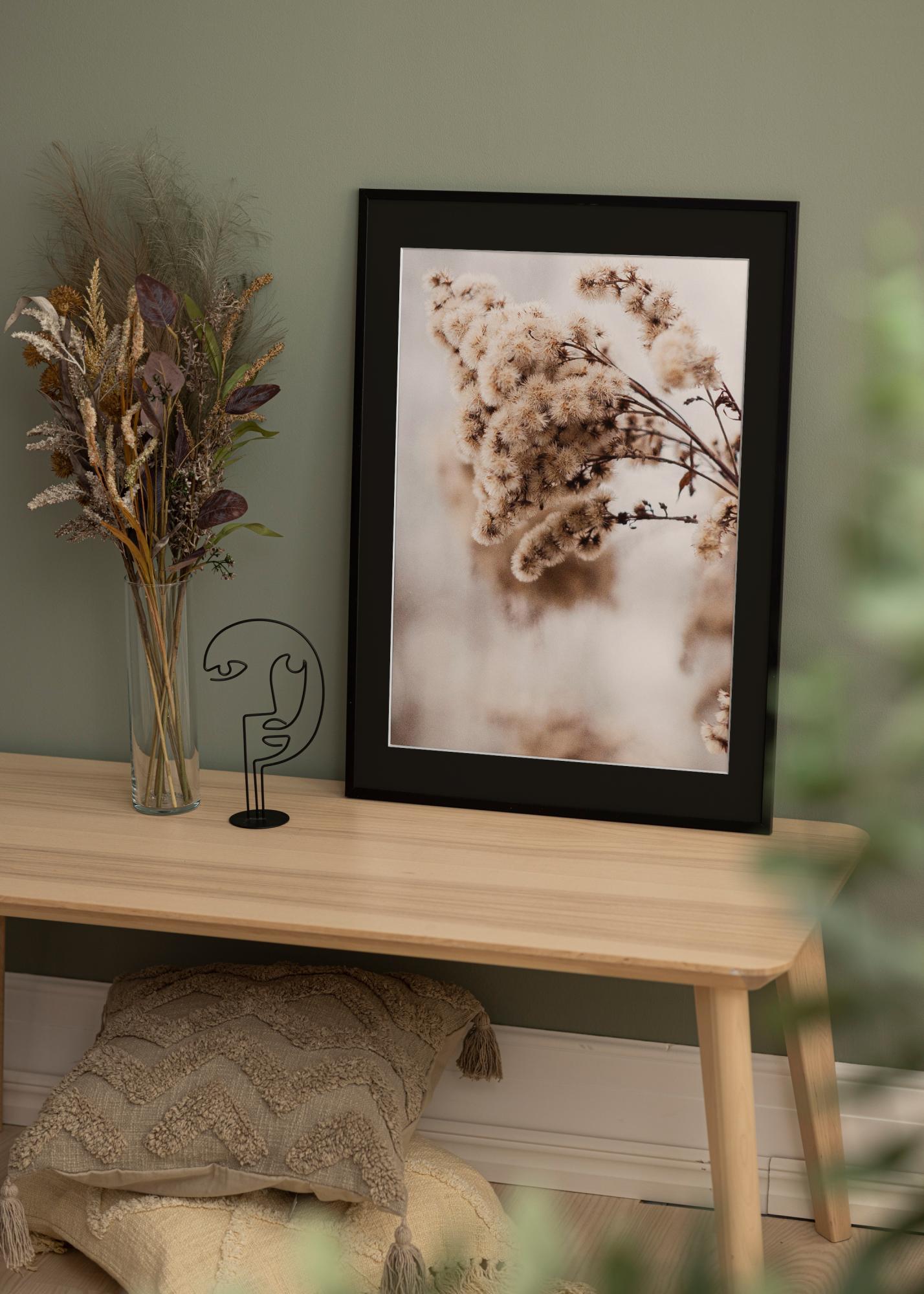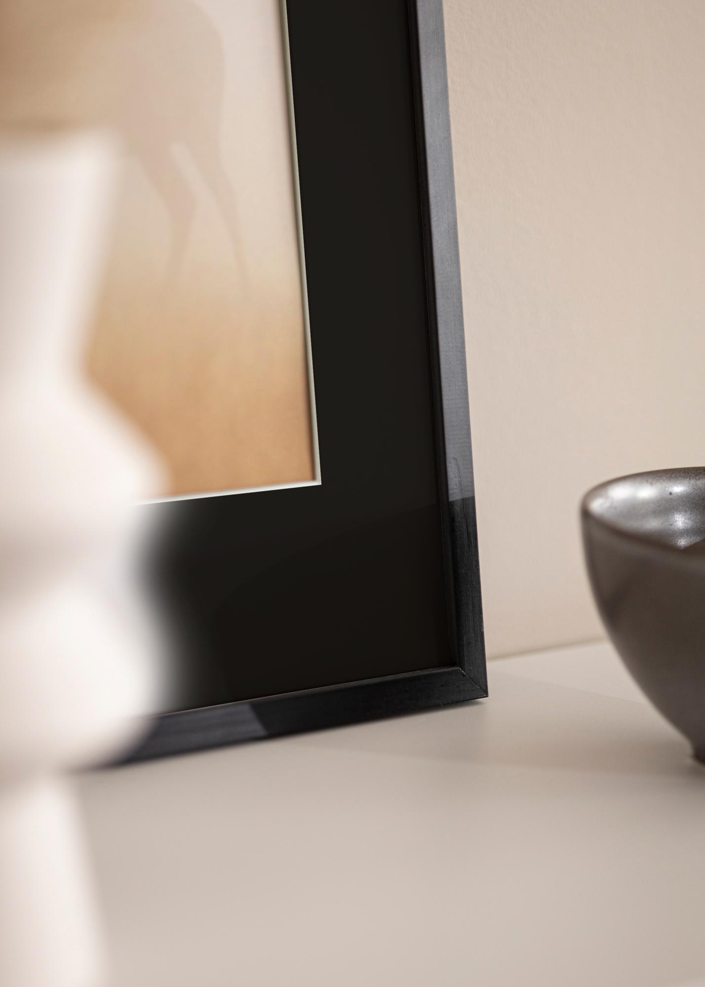 Okvir je izdelan s tankim profilom 13 mm v širino in globino, kar zagotavlja dobro ravnovesje med robustnostjo in subtilnostjo. Mat zaključek na okviru dopolnjuje paspartu in pomaga zmanjšati moteče refleksije. Okvir je prav tako opremljen s kovinskimi obešalnimi traki na hrbtni strani, kar omogoča enostavno obešanje slike tako horizontalno kot vertikalno, odvisno od usmerjenosti slike.