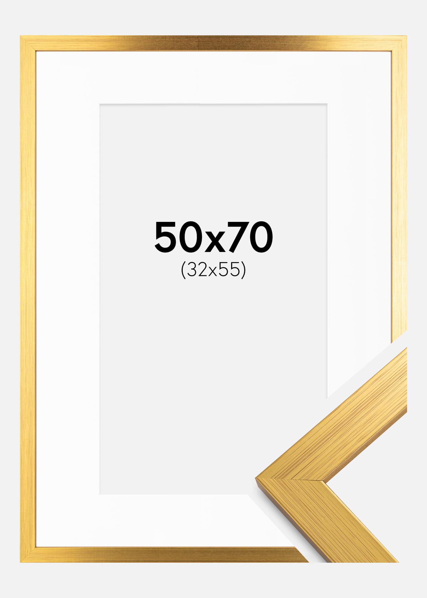Okvir je izdelan z mat zlato površino, ki doda dotik luksuza vaši notranji opremi. S širino 22 mm in globino 15 mm ima okvir robustno konstrukcijo, ki kljub temu ohranja eleganten profil. Bela pasparta se odlično ujema in je prilagojena za slike velikosti 33x56 cm, medtem ko so zunanje mere okvirja 53,4x73,4 cm.