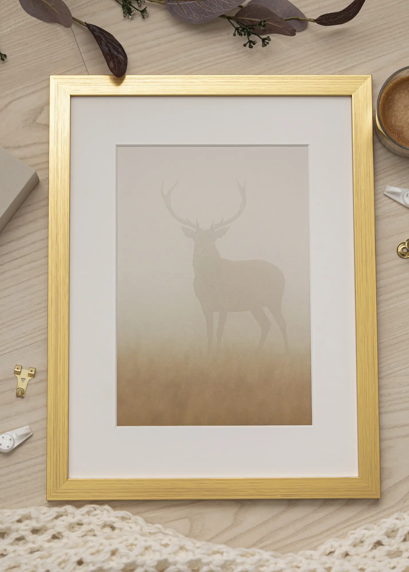Okvir ima mat zlato končno obdelavo, ki dopolnjuje belo paspartu in ustvarja harmonično predstavitev. Z širino 22 mm in globino 15 mm okvir daje občutek trdnosti, ne da bi prevladal. Poleg tega je opremljen z kovinskimi obešali na zadnji strani, kar omogoča enostavno obešanje vaše slike vodoravno ali navpično, odvisno od potreb vašega prostora.