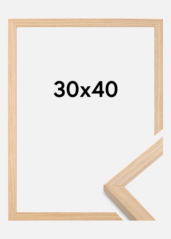 Grimsåker Okvir Hrast 22A 30x40 cm ima notranje mere 30x40 cm, medtem ko letev meri 1,7x2,25 cm.