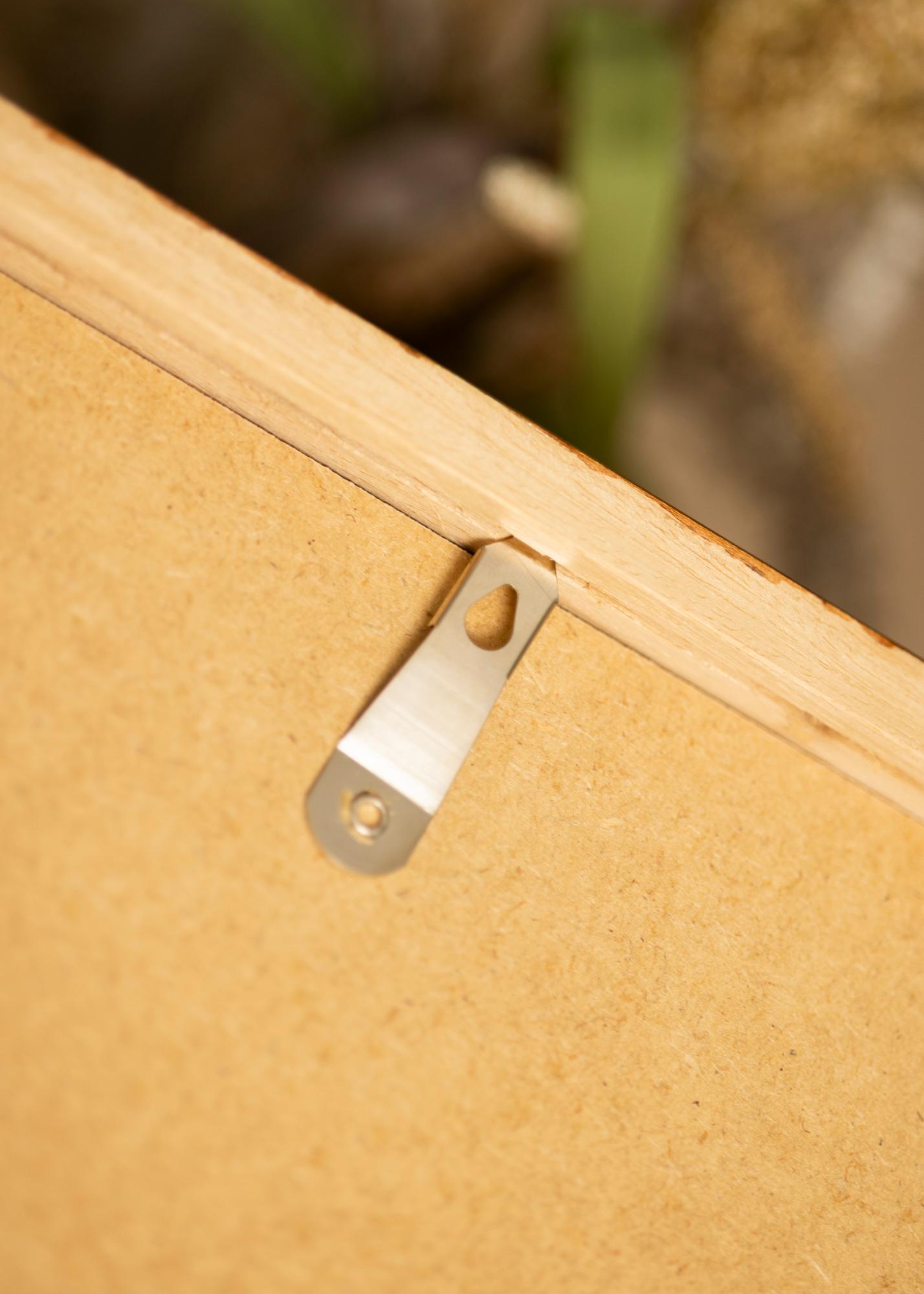 Izdelan iz robustnega ajousovega lesa, ta okvir ponuja trajnost in visokokakovostno predstavitev. Poleg tega je izdelan na Nizozemskem in je opremljen s praktičnim kovinskim obešalnikom na hrbtni strani, kar omogoča obešanje okvirja tako horizontalno kot vertikalno za maksimalno prilagodljivost.