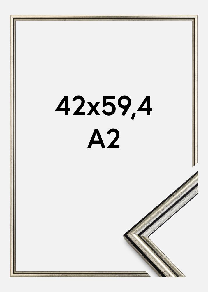 Odkrijte eleganco in sodoben dizajn z našim srebrnim okvirjem velikosti 42x59,4 cm (A2), ki je popoln za poudarjanje vaših najljubših umetnin ali fotografij. Ta foto okvir je stilni detajl v vsakem prostoru s svojimi subtilnimi črnimi pikami in dekorativnimi črnimi linijami, ki dodajo edinstveno globino in značaj.