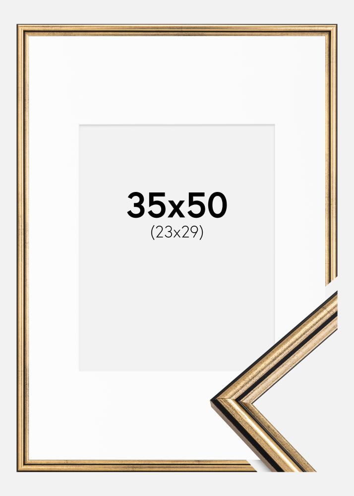 Dajte svojim slikam dodatno dimenzijo z elegantnim zlatim okvirjem, opremljenim z belo paspartu. Ta okvir za slike, prilagojen za velikost slike 24x30 cm, ponuja sofisticirano rešitev za izpostavljanje vaših fotografij ali umetniških del. Mat zlat okvir, s širino 15 mm in globino 14 mm, dodaja vaši notranjosti subtilno razkošnost.