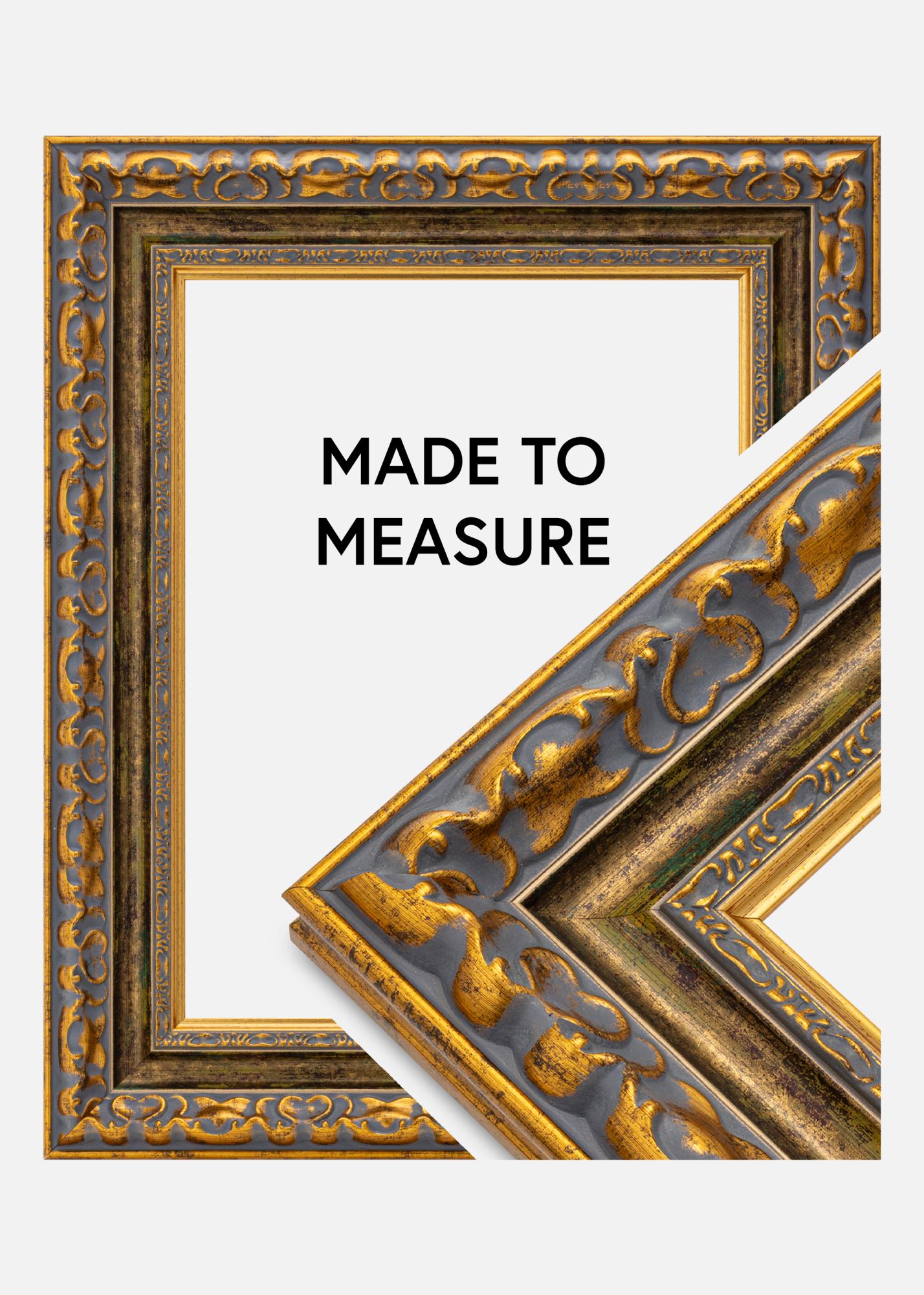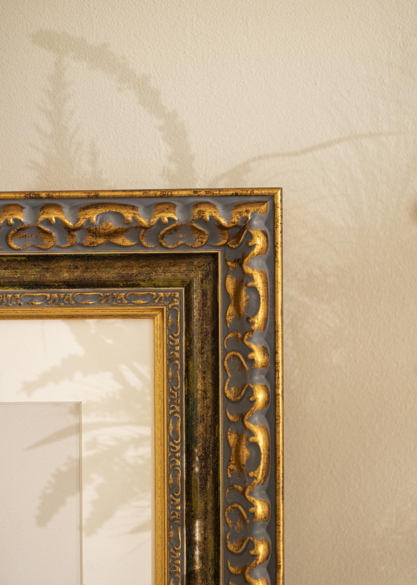 Želite sestaviti čudovito sliko s staro družinsko fotografijo ali lepo sliko družine? Tukaj imamo razkošen okvir, ki dodaja značaj in pritegne pozornost! Okvir je lepo obrabljen z vzorci, ki se spreminjajo v zlati in sivi oziroma zlati, zeleni in rjavi barvi. Ker se izdeluje v naši lastni okvirni delavnici, ste lahko prepričani, da boste dobili lep okvir za slike visoke kakovosti.